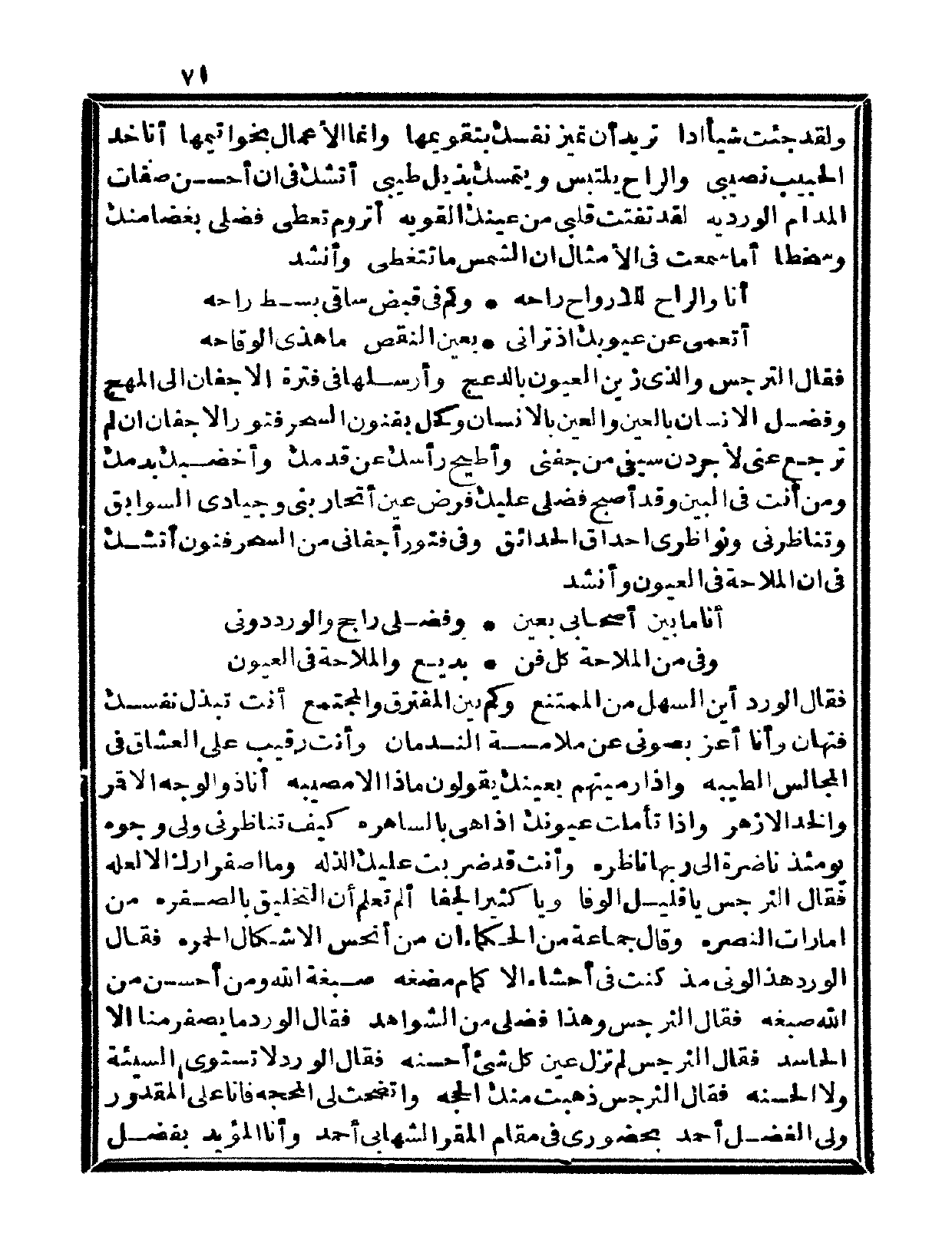 بذيل طيبي أتشك في أن أحسن صفات المدام الورديه لقد تفتت قلبي من عينك القوية أتروم تعطي فضلي بغضاً منك وسخطاً، أما سمعت في الأمثال أن الشمس ما تتغطى، وأنشد: