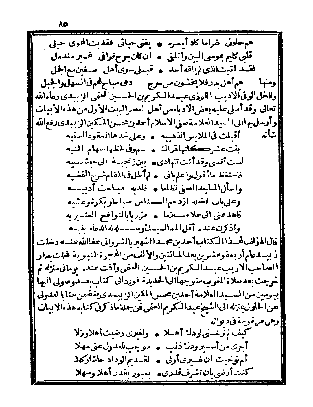 قال المؤلف لهذا الكتاب أحمد بن محمد الشهير بالشرواني عفا الله عنه دخلت زبيد عام أربع وعشرين بعد المائتين والألف من الهجرة النبوية فحللت بدار الصاحب الأريب عبد الكريم بن الحسين العتمي وأقمت عنده يوماً في منزله ثم خرجت بعد صلاة المغرب متوجهاً إلى الحديدة فورد إليّ كتاب بعد وصولي إليها بيومين من السيد العلامة أحمد بن محسن المكين الزبيدي يتضمن عتاباً لعدولي عن الحلول بمنزله إلى منزل الشيخ عبد الكريم العتمي فمن جملة ما ذكر في كتابه هذه الأبيات وهي مرقومة في ديوانه: