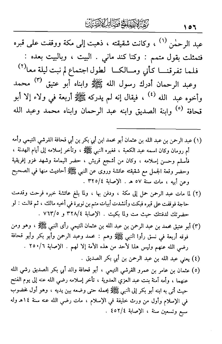 وعبد الرحمان أدرك رسول الله صلى الله عليه وسلم وابناه أبو عتيق محمد وأخوه عبد الله، فيقال إنه لم يدركه صلى الله عليه وسلم أربعة في ولاء إلا أبو قحافة وابنة الصديق وابنه عبد الرحمان وابناه محمد وعبد الله