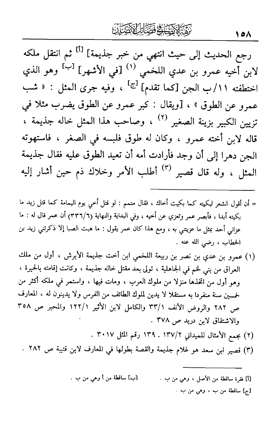 رجع الحديث إلى حيث انتهي من خبر جذيمة] ثم انتقل ملكه لابن أخيه عمرو بن عدي اللخمي [في الأشهر] وهو الذي اختطفته الجن [كما تقدم]، وفيه جرى المثل: ((شب عمرو عن الطوق))، [ويقال: كبر عمرو عن الطوق يضرب مثلاً في تزيين الكبير بزينة الصغير، وصاحب هذا المثل خاله جذيمة، قاله لابن أخته عمرو، وكان له طوق فلبسه في الصغر، فاستهوته الجن دهراً إلى أن وجد فأرادت أمه أن تعيد الطوق عليه فقال جذيمة المثل، وله قال قصير أطلب الأمر وخلاك ذم حين أشار إليه