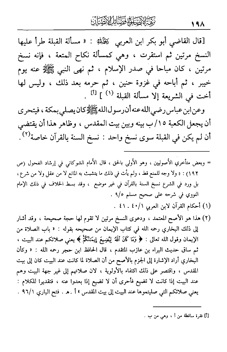 [قال القاضي أبو بكر ابن العربي رحمه الله: ((مسألة القبلة طرأ عليها النسخ مرتين ثم استقرت، وهي كمسألة نكاح المتعة، فإنه نسخ مرتين، كان مباحاً في صدر الإسلام، ثم نهى النبي صلى الله عليه وسلم عنه يوم خيبر، ثم أباحه في غزوة حنين، ثم حرمه بعد ذلك، وليس لها أخت في الشريعة إلا مسألة القبلة].