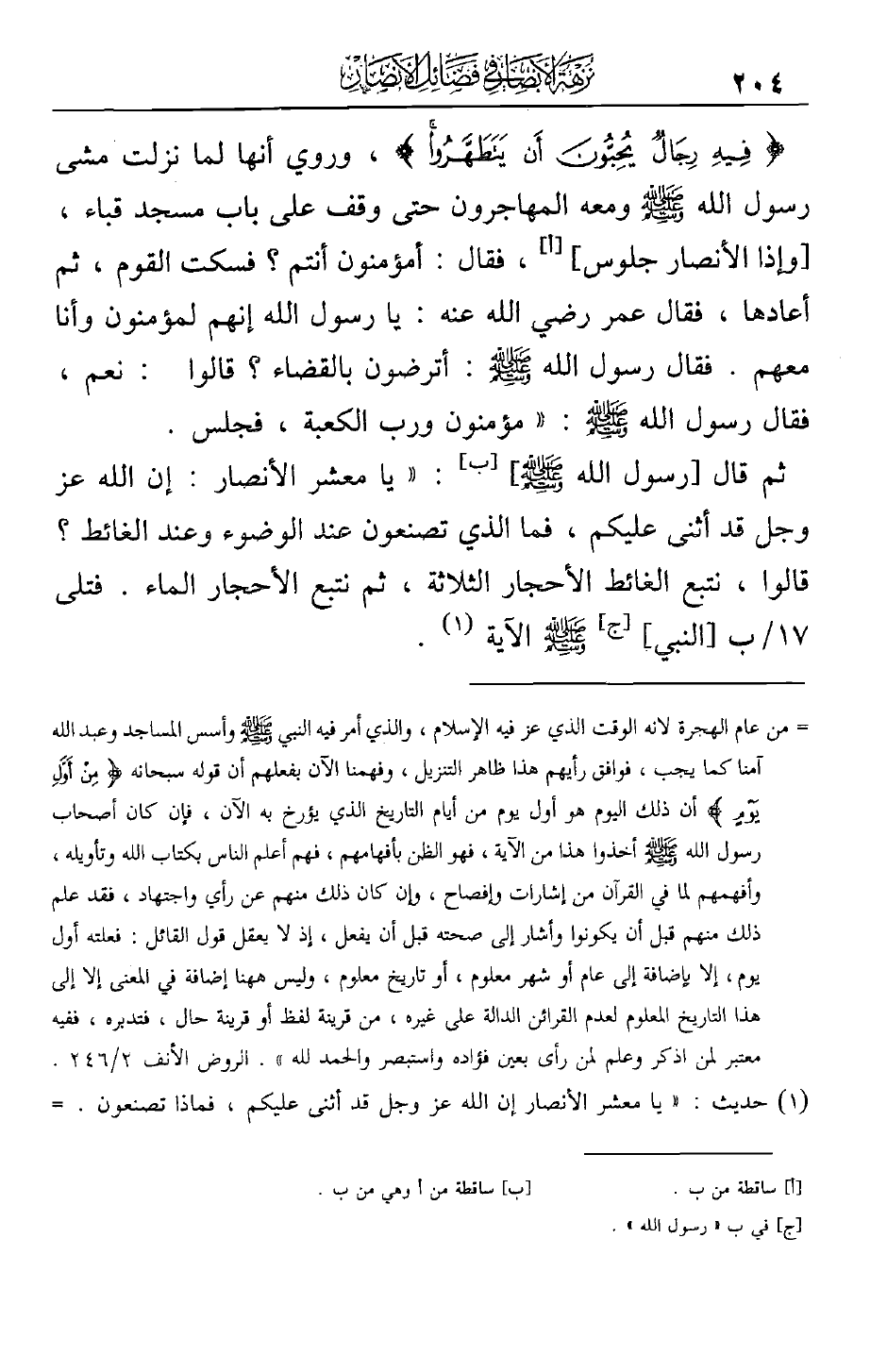 ثم قال [رسول الله صلى الله عليه وسلم ]: ((يا معشر الأنصار: إن الله عز وجل قد أثنى عليكم، فما الذي تصنعون عند الوضوء وعند الغائط؟ قالوا: نتبع الغائط الأحجار الثلاثة، ثم نتبع الأحجار الماء. فتلى [النبي صلى الله عليه وسلم الآية.