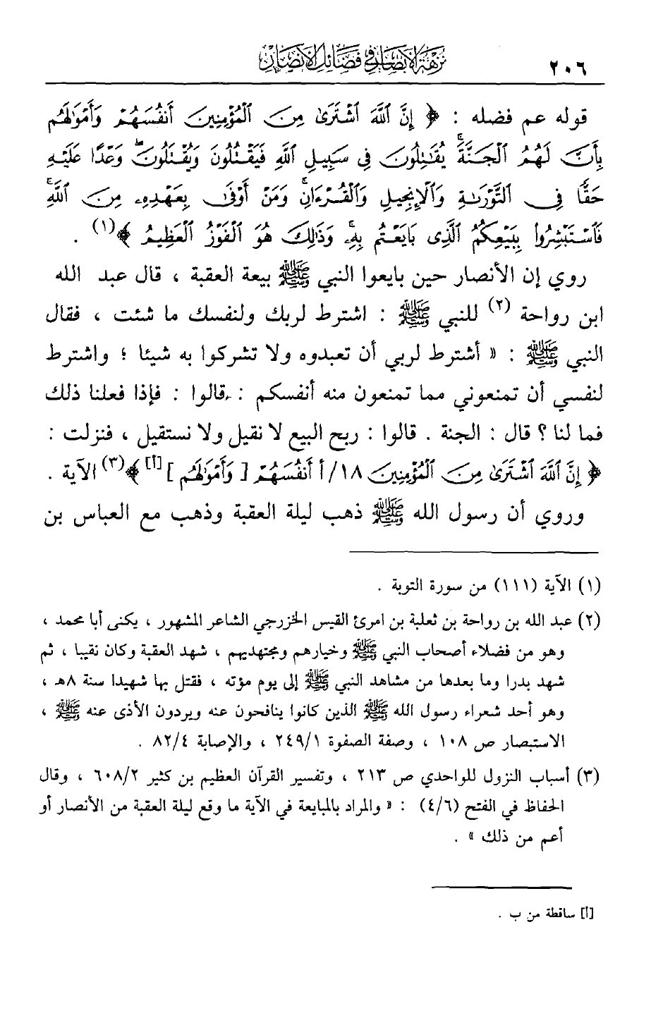 روي إن الأنصار حين بايعوا النبي صلى الله عليه وسلم بيعة العقبة، قال عبد الله ابن رواحة للنبي صلى الله عليه وسلم : اشترط لربك ولنفسك ما شئت، فقال النبي صلى الله عليه وسلم : ((أشترط لربي أن تعبدوه ولا تشركوا به شيئاً؛ واشترط لنفسي أن تمنعوني مما تمنعون منه أنفسكم: قالوا: فإذا فعلنا ذلك فما لنا؟ قال الجنة. قالوا: ربح البيع لا نقيل ولا نستقيل، فنزلت: {إن الله اشترى من المؤمنين أنفسهم [وأموالهم]} الآية.