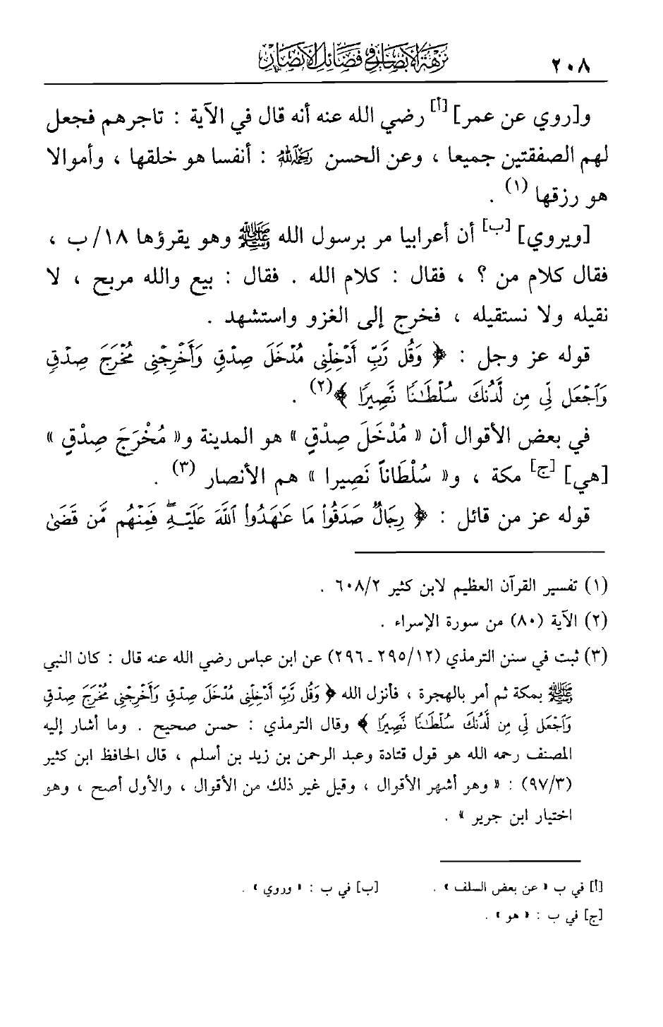 في بعض الأقوال أن ((مدخل صدقٍ)) هو المدينة و((مخرج صدقٍ)) [هي] مكة، و((سلطاناً نصيراً)) هم الأنصار.