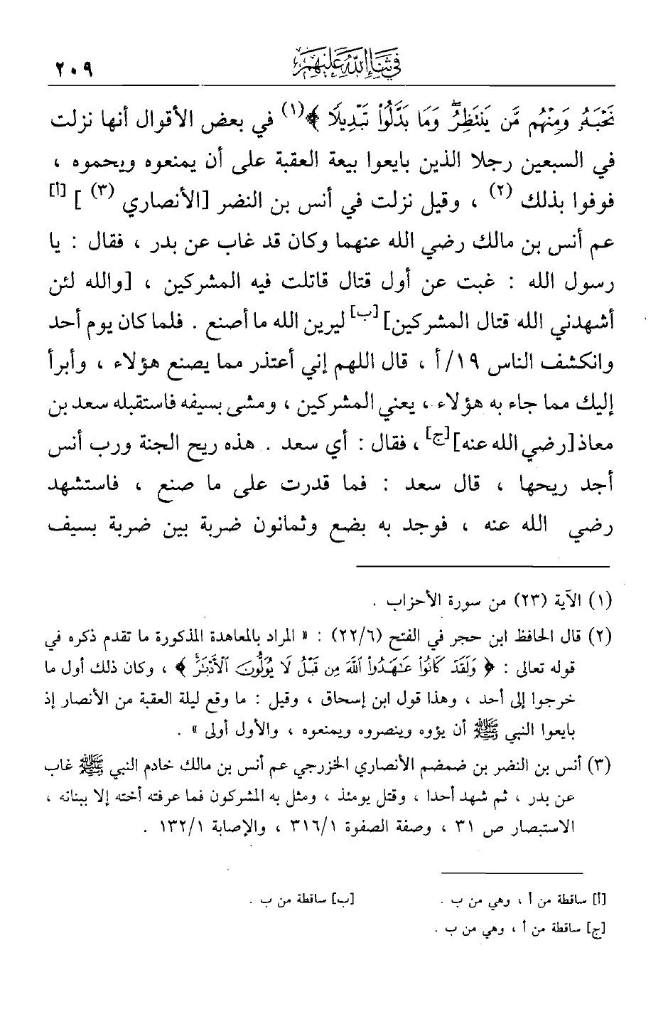 نحبه ومنهم من ينتظر وما بدلوا تبديلاً} في بعض الأقوال أنها نزلت في السبعين رجلاً الذين بايعوا بيعة العقبة على أن يمنعوه ويحموه، فوفوا بذلك، وقيل نزلت في أنس بن النضر [الأنصاري] عم أنس بن مالك رضي الله عنهما وكان قد غاب عن بدر، فقال: يا رسول الله: غبت عن أول قتال قاتلت فيه المشركين، [والله لئن أشهدني الله قتال المشركين] ليرين الله ما أصنع. فلما كان يوم أحد وانكشف الناس، قال اللهم إني أعتذر مما يصنع هؤلاء. وأبرأ إليك مما جاء به هؤلاء، يعني المشركين، ومشى بسيفه فاستقبله سعد بن معاذ [رضي الله عنه] فقال: أي سعد. هذه ريح الجنة ورب أنس أجد ريحها، قال سعد: فما قدرت على ما صنع، فاستشهد رضي الله عنه، فوجد به بضع وثمانون ضربة بين ضربة بسيف