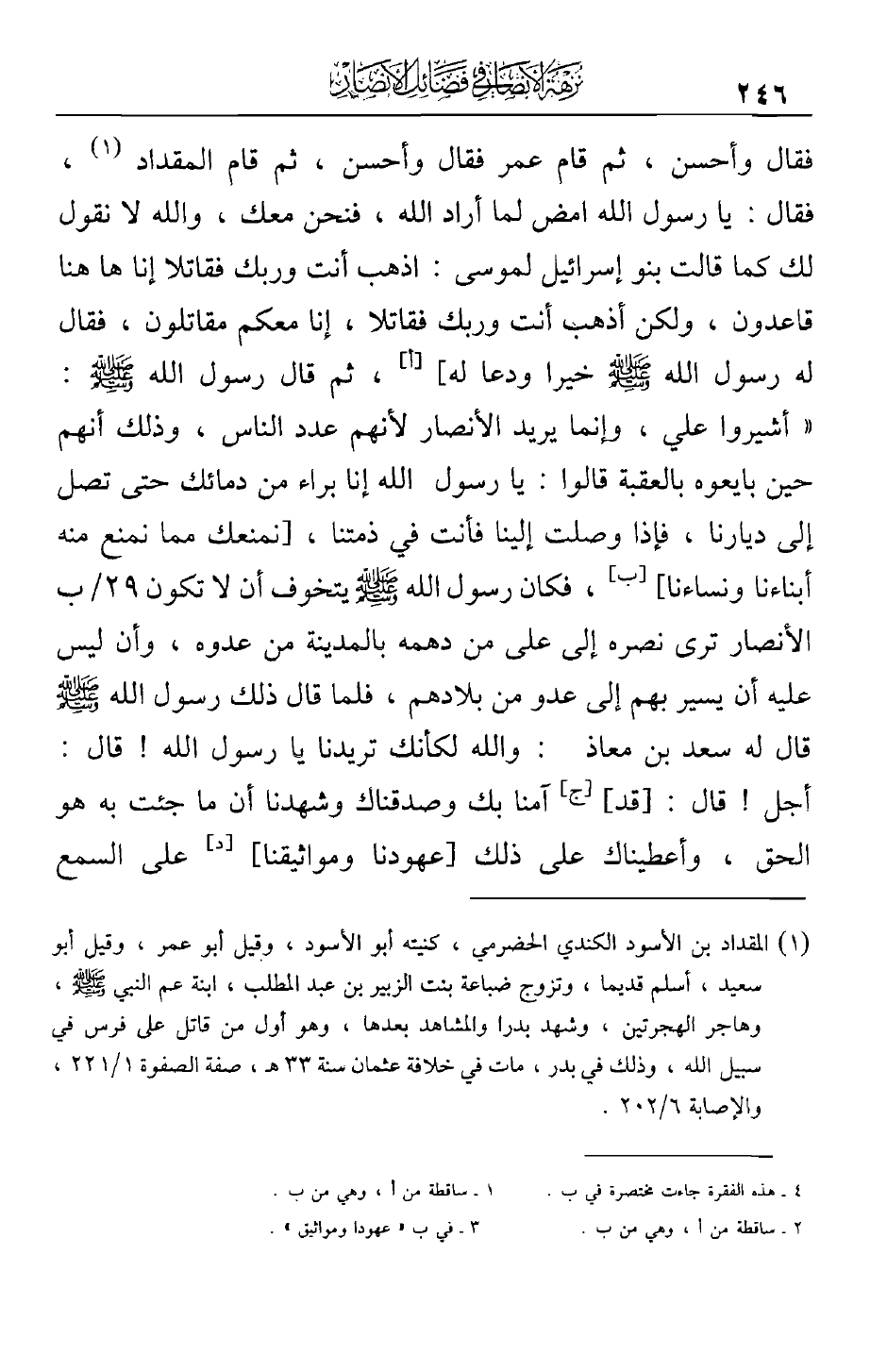 فقال وأحسن، ثم قام عمر فقال وأحسن، ثم قام المقداد، فقال: يا رسول الله امض لما أراد الله، فنحن معك، والله لا نقول لك كما قالت بنو إسرائيل لموسى: اذهب أنت وربك فقاتلا إن ها هنا قاعدون، ولكن اذهب أنت وربك فقاتلا، إنا معكم مقاتلون، فقال له رسول الله صلى الله عليه وسلم خيراً ودعا له]، ثم قال رسول الله صلى الله عليه وسلم : ((أشيروا علي، وإنما يريد الأنصار لأنهم عدد الناس، وذلك أنهم حين بايعوه بالعقبة قالوا: يا رسول الله إنا براء من دمائك حتى تصل إلى ديارنا، فإذا وصلت إلينا فأنت في ذمتنا، [نمنعك مما نمنع منه أبناءنا ونساءنا]، فكان رسول الله صلى الله عليه وسلم يتخوف أن لا تكون الأنصار ترى نصره إلى على من دهمه بالمدينة من عدوه، وأن ليس عليه أن يسير بهم إلى عدو من بلادهم، فلما قال ذلك رسول الله صلى الله عليه وسلم قال له سعد بن معاذ: والله لكأنك تريدنا يا رسول الله! قال أجل! قال: [قد] آمنا بك وصدقناك وشهدنا أن ما جئت به هو الحق، وأعطيناك على ذلك [عهودنا ومواثيقنا] على السمع