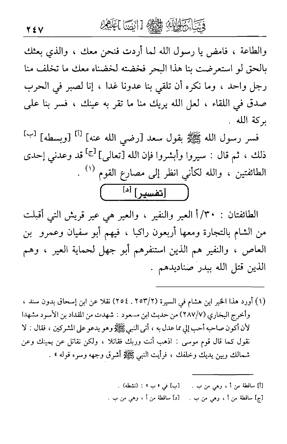 فسر رسول الله صلى الله عليه وسلم بقول سعد [رضي الله عنه] [وبسطه] ذلك ثم قال: سيروا وأبشروا فإن الله [تعالى] قد وعدني إحدى الطائفتين، والله لكأني أنظر إلى مصارع القوم.