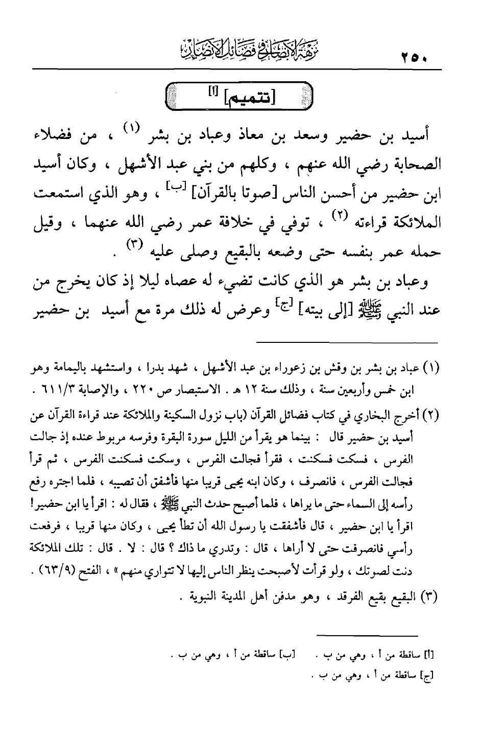 أسيد بن حضير وسعد بن معاذ وعباد بن بشر، من فضلاء الصحابة رضي الله عنهم، وكلهم من بني عبد الأشهل، وكان أسيد ابن حضير من أحسن الناس [صوتاً بالقرآن]، وهو الذي استمعت الملائكة قراءته، توفي في خلافة عمر رضي الله عنهما، وقيل حمله عمر بنفسه حتى وضعه بالبقيع وصلى عليه.
