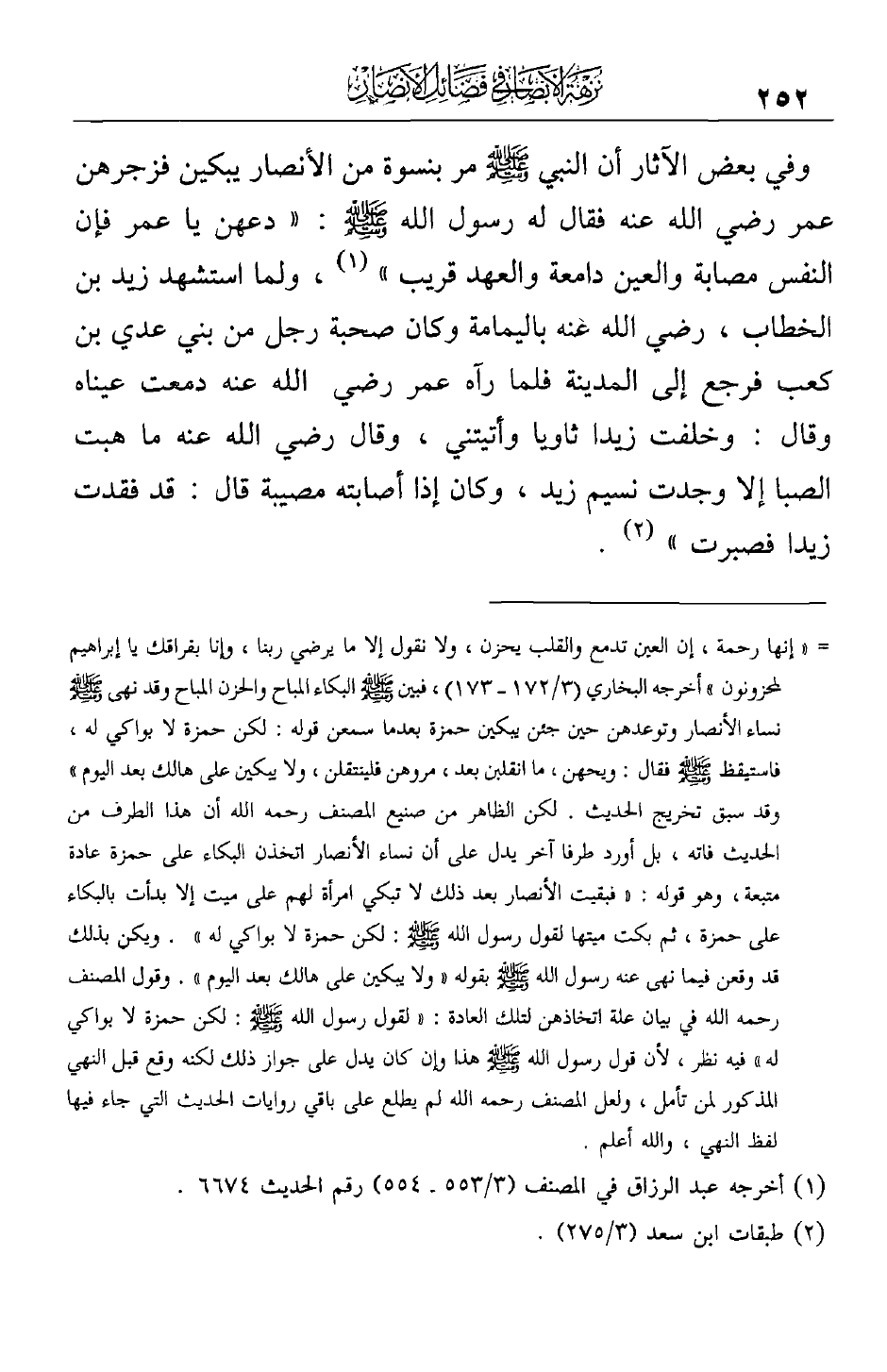 وفي بعض الآثار أن النبي صلى الله عليه وسلم مر بنسوة من الأنصار يبكين فزجرهن عمر رضي الله عنه فقال له رسول الله صلى الله عليه وسلم : ((دعهن يا عمر فإن النفس مصابة والعين دامعة والعهد قريب))، ولما استشهد زيد بن الخطاب، رضي الله عنه باليمامة وكان صحبة رجل من بني عدي بن كعب فرجع إلى المدينة فلما رآه عمر رضي الله عنه دمعت عيناه وقال: وخلفت زيداً ثاوياً وأتيتني، وقال رضي الله عنه ما هبت الصبا إلا وجدت نسيم زيد، وكان إذا أصابته مصيبة قال: قد فقدت زيداً فصبرت)).