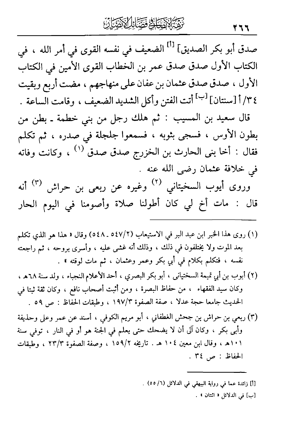 صدق أبو بكر الصديق] الضعيف في نفسه القوي في أمر الله، في الكتاب الأول صدق صدق عمر بن الخطاب القوي الأمين في الكتاب الأول، صدق صدق عثمان بن عفان على منهاجهم، مضت أربع وبقيت [سنتان] أتت الفتن وأكل الشديد الضعيف، وقامت الساعة.
