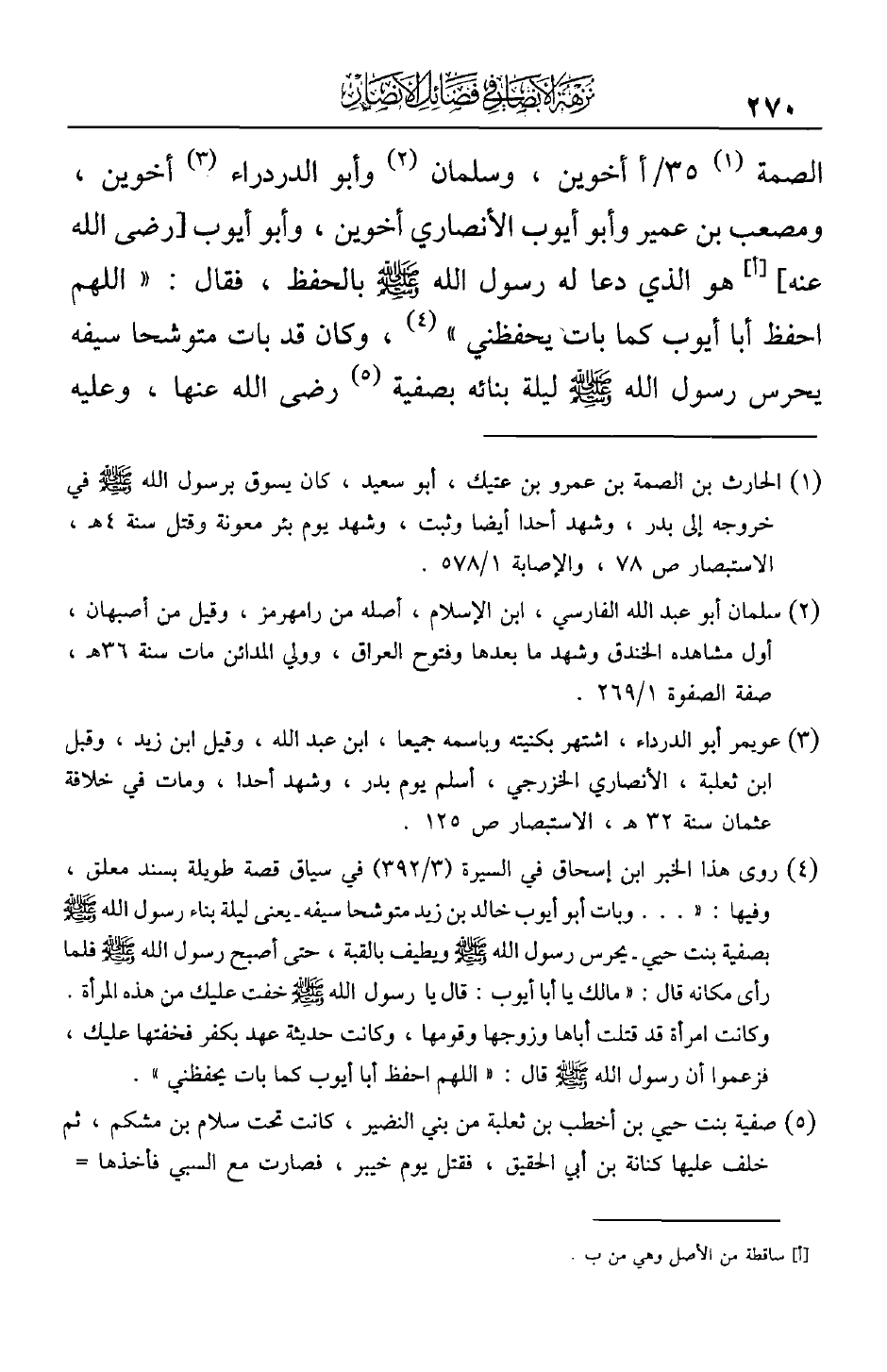 الصمة أخوين، وسلمان وأبو الدرداء أخوين، ومصعب بن عمير وأبو أيوب الأنصاري أخوين، وأبو أيوب [رضي الله عنه] هو الذي دعا له رسول الله صلى الله عليه وسلم بالحفظ، فقال: ((اللهم احفظ أبا أيوب كما بات يحفظني))، وكان قد بات متوشحاً سيفه يحرس رسول الله صلى الله عليه وسلم ليلة بنائه بصفية رضي الله عنها، وعليه