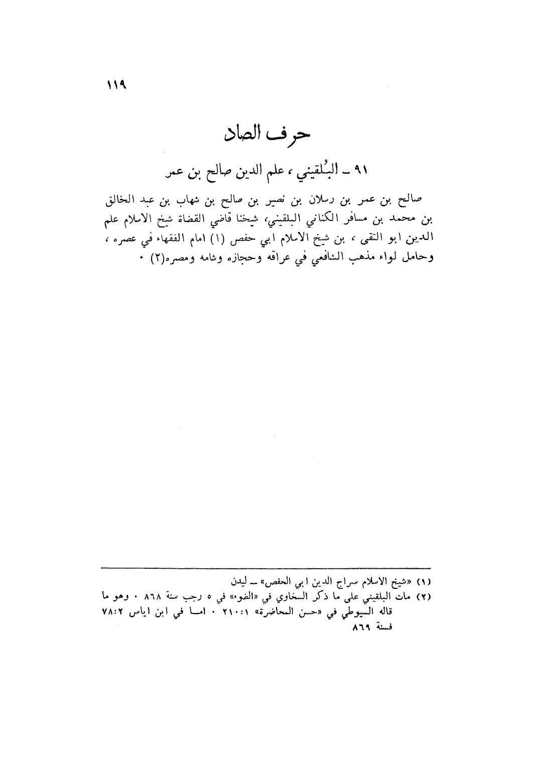 صَالح بن عمر بن رسْلَان بن نصير بن صَالح بن شهَاب بن عبد الْخَالِق بن مُحَمَّد بن مُسَافر الْكِنَانِي البُلْقِينِيّ، شَيخنَا قَاضِي الْقُضَاة شيخ الْإِسْلَام علم الدّين أَبُو التقى، بن شيخ الْإِسْلَام أبي حَفْص إِمَام الْفُقَهَاء فِي عصره، وحامل لِوَاء مَذْهَب الشَّافِعِي فِي عراقه وحجازه وشامه ومصره.
