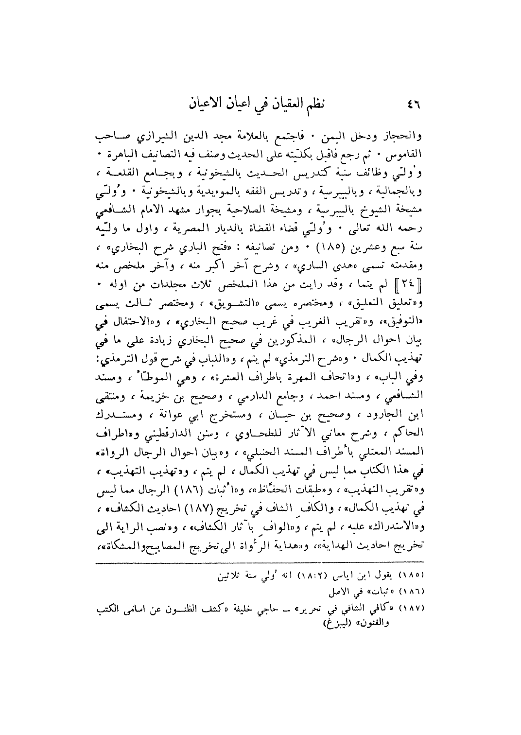 والحجاز وَدخل الْيمن. فأجتمع بالعلامة مجد الدّين الشِّيرَازِيّ صَاحب الْقَامُوس. ثمَّ رَجَعَ فَأقبل بكليته على الحَدِيث وصنف فِيهِ التصانيف الباهرة. وَولي وظائف سنية كتدريس الحَدِيث بالشيخونية، وبجامع القلعة، وبالجمالية، وبالبيبرسية وتدريس الْفِقْه بالمؤيدية وبالشيخونية وَولي مشيخة الشُّيُوخ بالبيبرسية، ومشيخة الصلاحية بجوار مشْهد الإِمَام الشَّافِعِي رَحمَه الله تَعَالَى. وَولي قَضَاء الْقُضَاة بالديار المصرية، وَأول مَا وليه سنة سبع وَعشْرين. وَمن تصانيفه " فتح الْبَارِي شرح البُخَارِيّ "، ومقدمته تسمى " هدى الساري "، وَشرح آخر أكبر مِنْهُ، وَآخر ملخص مِنْهُ لم يتما، وَقد رَأَيْت من هَذَا الملخص ثَلَاث مجلدات من أَوله. و " تَعْلِيق التَّعْلِيق "، ومختصره يُسمى " التشويق "، ومختصر ثَالِث يُسمى " التَّوْفِيق "، و " تقريب الْغَرِيب فِي غَرِيب صَحِيح البُخَارِيّ "، و " الاحتفال فِي بَيَان أَحْوَال الرِّجَال "، الْمَذْكُورين فِي صَحِيح البُخَارِيّ زِيَادَة على مَا فِي تَهْذِيب الْكَمَال. و " شرح التِّرْمِذِيّ " لم يتم، و " اللّبَاب فِي شرح قَول التِّرْمِذِيّ: وَفِي الْبَاب "، و " إتحاف المهرة بأطراف الْعشْرَة "، وَهِي الْمُوَطَّأ، ومسند الشَّافِعِي، ومسند أَحْمد، وجامع الدَّارمِيّ، وصحيح بن خُزَيْمَة، ومنتقى ابْن الْجَارُود، وصحيح بن حَيَّان، ومستخرج أبي عوَانَة، ومستدرك الْحَاكِم، وَشرع مَعَاني الْآثَار للطحاوي، وَسنَن الدارقطيني و " أَطْرَاف الْمسند المعتلي بأطراف الْمسند الْحَنْبَلِيّ "، و " بَيَان أَحْوَال الرِّجَال الروَاة " فِي هَذَا الْكتاب مِمَّا لَيْسَ فِي تَهْذِيب الْكَمَال، لم يتم، و " تَهْذِيب التَّهْذِيب "، و " تقريب التَّهْذِيب "، و " طَبَقَات الْحفاظ "، و " أثبات الرِّجَال مِمَّا لَيْسَ فِي تَهْذِيب الْكَمَال "، وَالْكَاف الشاف فِي تَخْرِيج أَحَادِيث الْكَشَّاف "، و " الإستدراك " عَلَيْهِ، لم يتم، و " الواف بآثار الْكَشَّاف "، و " نصب الرَّايَة إِلَى تَخْرِيج أَحَادِيث الْهِدَايَة "، و " هِدَايَة الروَاة إِلَى تَخْرِيج المصابيح والمشكاة "،