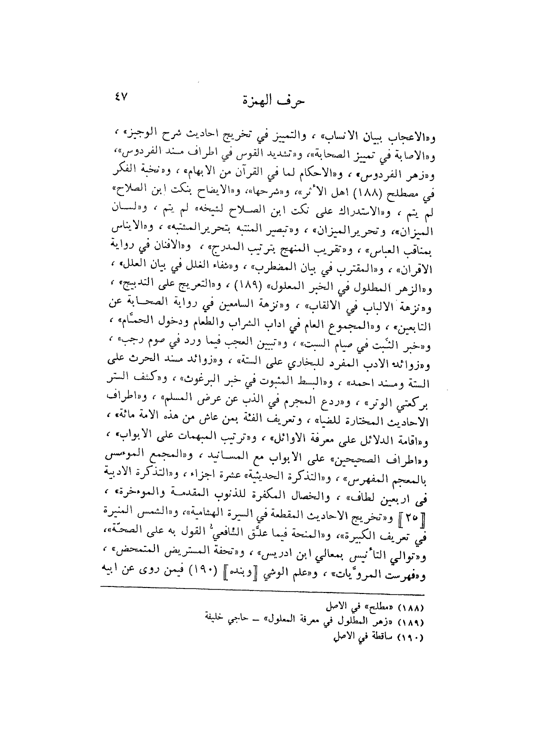 و " الْإِعْجَاب بِبَيَان الْأَنْسَاب "، والتمييز فِي تَخْرِيج أَحَادِيث شرح الْوَجِيز "، و " الْإِصَابَة فِي تَمْيِيز الصَّحَابَة "، و " تَشْدِيد الْقوس فِي أَطْرَاف مُسْند الفردوس "، و " زهر الفردوس "، و " الْأَحْكَام لما فِي الْقُرْآن من الْإِبْهَام "، و " نخبة الْفِكر فِي مصطلح أهل الْأَثر "، و " شرحها "، و " الْإِيضَاح بنكت ابْن الصّلاح " لم يتم، و " الإستدراك على نكت ابْن الصّلاح لشيخه " لم يتم، ولسان الْمِيزَان "، وتحرير الْمِيزَان "، و " تبصير المنتبه بتحرير المشتبه "، و " الإيناس بمناقب الْعَبَّاس "، و " تقريب الْمنْهَج بترتيب المدرج "، و " الإفنان فِي رِوَايَة الأقران "، و " المقترب فِي بَيَان المضطرب "، و " شِفَاء الغلل فِي بَيَان الْعِلَل "، و " الزهر المطلول فِي الْخَبَر الْمَعْلُول "، و " التعريج على التدبيج "، و " نزهة الالباب فِي الألقاب "، و " نزهة السامعين فِي رِوَايَة الصَّحَابَة عَن التَّابِعين "، و " الْمَجْمُوع الْعَام فِي آدَاب الشَّرَاب وَالطَّعَام وَدخُول الْحمام "، و " خبر الثبت فِي صِيَام السبت "، و " تَبْيِين الْعجب فِيمَا ورد فِي صَوْم رَجَب "، وزوائد الْأَدَب الْمُفْرد للْبُخَارِيّ على السِّتَّة "، و " زَوَائِد مُسْند الْحَرْث على السِّتَّة ومسند أَحْمد "، و " الْبسط المثبوت فِي خبر البرغوث "، و " كشف السّتْر بركعتي الْوتر "، و " ردع المجرم فِي الذب عَن عرض الْمُسلم "، و " أَطْرَاف الْأَحَادِيث المختارة للضيا "، وتعريف الفئة بِمن عَاشَ، من هَذِه الْأمة مائَة "، و " إِقَامَة الدَّلَائِل على معرفَة الْأَوَائِل "، و " تَرْتِيب المبهمات على الْأَبْوَاب "، و " أَطْرَاف الصَّحِيحَيْنِ " على الْأَبْوَاب مَعَ المسانيد، و " الْمجمع المؤسس بالمعجم المفهرس "، و " التَّذْكِرَة الحديثية " عشرَة أَجزَاء، و " التَّذْكِرَة الأدبية فِي أَرْبَعِينَ لطاف "، والخصال المكفرة للذنوب الْمُقدمَة والمؤخرة "، و " تَخْرِيج الاحاديث الْمُقطعَة فِي السِّيرَة الهشامية "، و " الشَّمْس المنيرة فِي تَعْرِيف الْكَبِيرَة "، والمنحة فِيمَا علق الشَّافِعِي القَوْل بِهِ على الصِّحَّة "، و " توالي التأنيس بمعالي ابْن إِدْرِيس "، و " تحفة المستريض المتمحض "، و " فهرست المرويات "، و " علم الوشي وبنده فِيمَن روى عَن أَبِيه