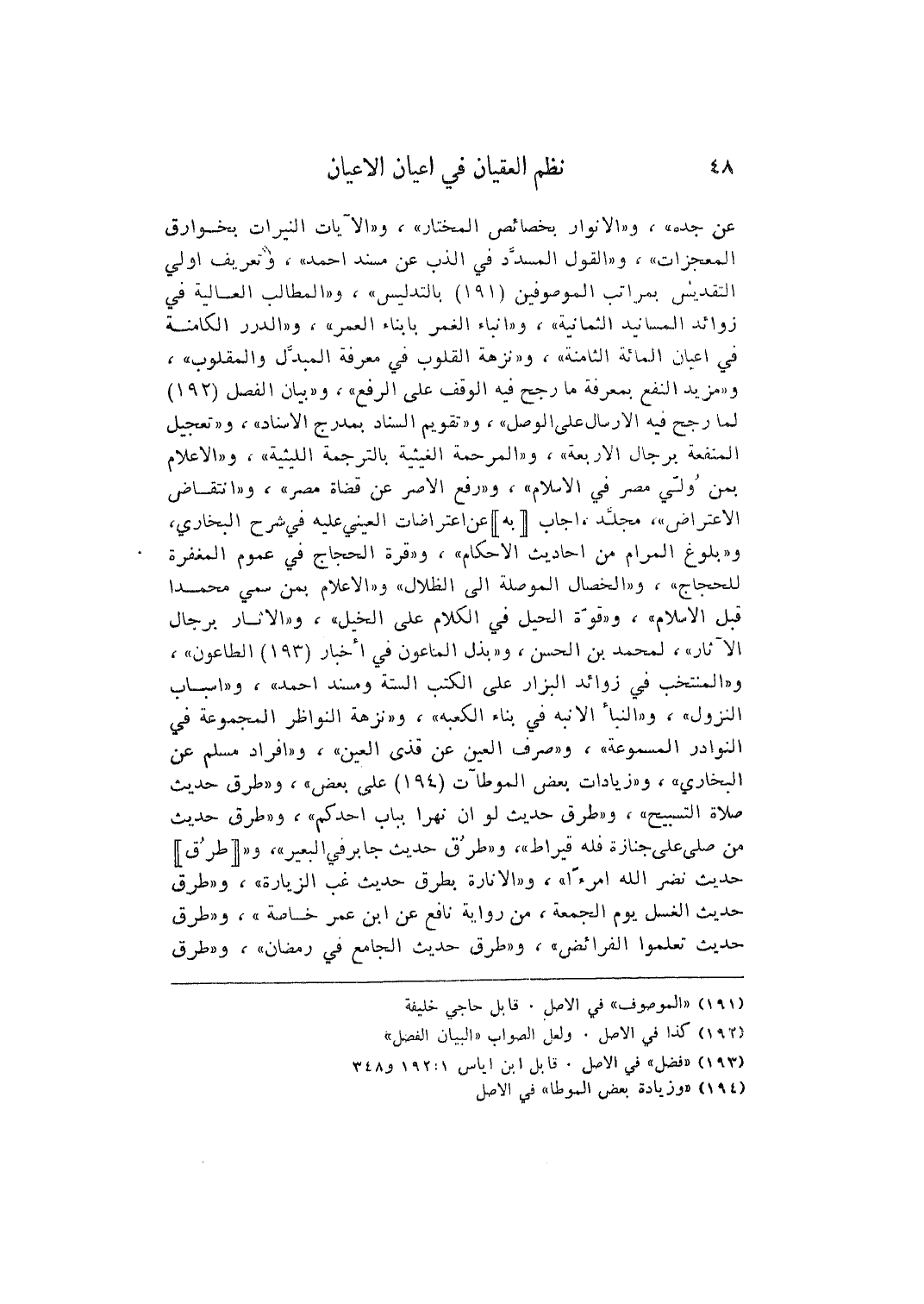 عَن جده "، والأنوار بخصائص الْمُخْتَار "، والآيات النيرات بخوارق المعجزات " و " القَوْل المسدد فِي الذب عَن مُسْند أَحْمد "، وتعريف أولي التَّقْدِيس بمراتب الموصوفين بالتدليس "، و " المطالب الْعَالِيَة فِي زَوَائِد المسانيد الثَّمَانِية ". وأنباء الْغمر بابناء الْعُمر "، و " الدّرّ الكامنة فِي أَعْيَان الْمِائَة الثَّامِنَة "، و " نزهة الْقُلُوب فِي معرفَة الْمُبدل والمقلوب "، و " مزِيد النَّفْع بِمَعْرِِفَة مَا رجح فِيهِ الْوَقْف على الرّفْع "، و " بَيَان الْفَصْل لما رجح فِيهِ الْإِرْسَال على الْوَصْل "، و " تَقْوِيم السناد بمدرج الْإِسْنَاد "، و " تَعْجِيل الْمَنْفَعَة بِرِجَال الْأَرْبَعَة "، و " المرحمة الغيثية بالترجمة الليثية "، و " الْأَعْلَام بِمن ولي مصر فِي الْإِسْلَام "، و " رفع الأصر عَن قُضَاة مصر "، و " أنتقاض الأعتراض "، مُجَلد، أجَاب بِهِ عَن أعتراضات الْعَيْنِيّ عَلَيْهِ فِي شرح البُخَارِيّ، و " بُلُوغ المرام من أَحَادِيث الْأَحْكَام "، و " وقرة الْحجَّاج فِي عُمُوم الْمَغْفِرَة للحجاج "، و " الْخِصَال الموصلة إِلَى الظلال " و " الْأَعْلَام بِمن سمي مُحَمَّد قبل الْإِسْلَام "، و " قُوَّة الْحِيَل فِي الْكَلَام على الْخَيل " و " الأثار بِرِجَال الأثار "، لمُحَمد بن الْحسن، و " بذل الماعون فِي أَخْبَار الطَّاعُون "، والمنتخب فِي زَوَائِد الْبَزَّار على الْكتب السِّتَّة ومسند أَحْمد "، و " أَسبَاب النُّزُول "، و " النبأ الأنبه فِي بِنَاء الْكَعْبَة "، و " نزهة النواظر الْمَجْمُوعَة فِي النَّوَادِر المسموعة "، و " صرف الْعين عَن قذى الْعين "، و " أَفْرَاد مُسلم عَن البُخَارِيّ "، و " زيادات بعض الموطآت على بعض "، و " طرق حَدِيث صَلَاة التَّسْبِيح "، وطرق حَدِيث لَو أَن نَهرا بِبَاب أحدكُم "، و " طرق حَدِيث من صلى على الْجِنَازَة فَلهُ فيراط "، و " طرق حَدِيث جَابر فِي الْبَعِير "، و " طرق حَدِيث نضرالله امراءاً "، و " الإنارة بطرق حَدِيث غب الزِّيَارَة "، و " طرق حَدِيث الْغسْل يَوْم الْجُمُعَة، من رِوَايَة نَافِع عَن ابْن عمر خَاصَّة "، و " طرق حَدِيث تعلمُوا الْفَرَائِض "، و " طرق حَدِيث الْجَامِع فِي رَمَضَان "، و " طرق