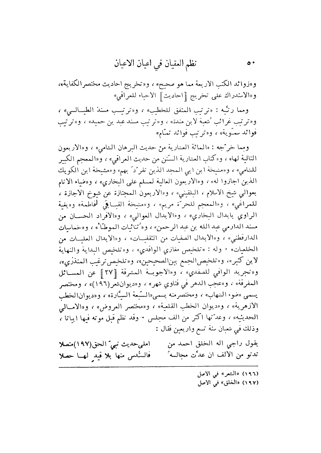 وَمِمَّا خرجه: " الْمِائَة العشارية من حَدِيث الْبُرْهَان الشَّامي "، و " الْأَرْبَعُونَ التالية لَهَا "، و " كتاب العشارية السّنَن من حَدِيث الْعِرَاقِيّ "، و " والمعجم الْكَبِير للشامي "، و " ومشيخة ابْن أبي الْمجد الَّذين تفرد بهم " و " مشيخة ابْن الكويك الَّذين أَجَازُوا لَهُ "، وَالْأَرْبَعُونَ الْعَالِيَة لمُسلم على البُخَارِيّ "، و " ضِيَاء الْأَنَام بعوالي شيخ الْإِسْلَام، البُلْقِينِيّ "، و " الْأَرْبَعُونَ المجتازة عَن شُيُوخ الْإِجَازَة، " للمراغي "، و " المعجم للْحرَّة مَرْيَم "، و " مشيخة القباقبي لفاطمة " و " بغية الرَّاوِي بابدال البُخَارِيّ "، و " الْإِبْدَال العوالي "، و " الْإِفْرَاد الحسان من مُسْند الدَّارمِيّ عبد الله بن عبد الرَّحْمَن "، و " ثنائيات الْمُوَطَّأ "، و " خماسيات الدَّارَقُطْنِيّ "، و " الْإِبْدَال الصفيات من الثقفيات "، و " الْإِبْدَال العليات من الخلعيات ". وَله: " تَلْخِيص مغازي الْوَاقِدِيّ "، وتلخيص الْبِدَايَة وَالنِّهَايَة لِابْنِ كثيرس وتلخيص الْجمع بَين الصَّحِيحَيْنِ "، و " تَلْخِيص ترغيب الْمُنْذِرِيّ "، و " تَجْرِيد الوافي للصفدي "، و " الْأَجْوِبَة المشرقة عَن الْمسَائِل المفرقة "، و " عجب الدَّهْر فِي فتاوي شهر "، و " ديوَان شعر "، ومختصر يُسمى " ضوء الشهَاب "، ومختصر مِنْهُ يُسمى " السَّبْعَة السيارة " و " ديوَان الْخطب الأزهرية "، و " ديوَان الْخطب القلعية "، و " مُخْتَصر الْعرُوض "، و " الأمالي الحديثيه "، وعدتها أَكثر من ألف مجْلِس. وَقد نظم قبل مَوته فِيهَا أبياتاً، وَذَلِكَ فِي شعْبَان سنة تسع وَأَرْبَعين فَقَالَ: