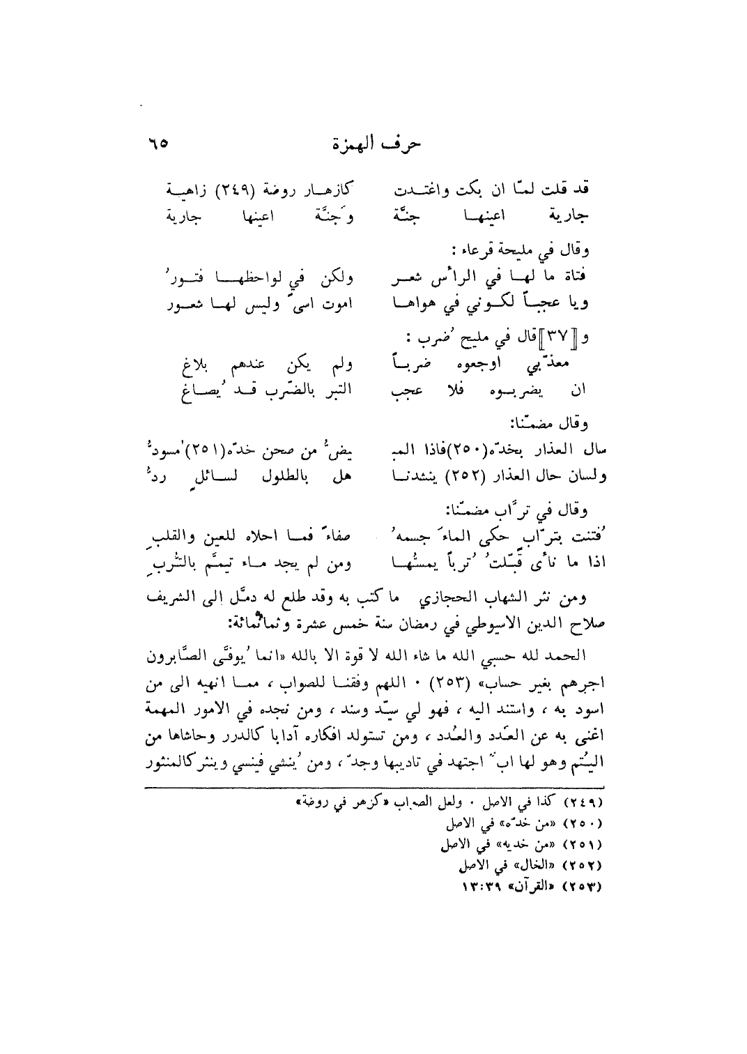 وَمن نثر الشهَاب الْحِجَازِي مَا كتب بِهِ وَقد طلع لَهُ دمل إِلَى الشريف صَلَاح الدّين الأسيوطي فِي رَمَضَان سنة خمس عشرَة وَثَمَانمِائَة: الْحَمد لله حسبي الله مَا شَاءَ الله لَا قُوَّة إِلَّا بِاللَّه " إِنَّمَا يُوفى الصَّابِرُونَ أجرهم بِغَيْر حِسَاب ". اللَّهُمَّ وفقنا للصَّوَاب، مِمَّا أنهيه إِلَى من أسود بِهِ، واستند إِلَيْهِ، فَهُوَ لي سيد وَسَنَد، وَمن نجده فِي الْأُمُور المهمة أغْنى بِهِ عَن الْعدَد وَالْعدَد، وَمن تستولد أفكاره آدابا كالدرر وحاشاها من الْيُتْم وَهُوَ لَهَا أَب اجْتهد فِي تأديبها وجد، وَمن ينشي فينسي وينثر كالمنثور
