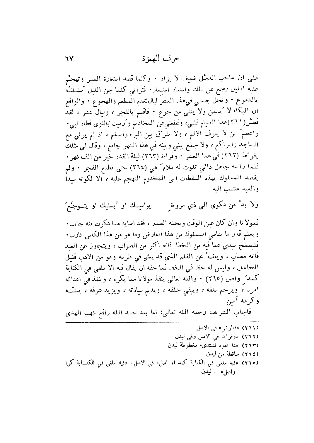 فمولانا وَأَن كَانَ عين الْوَقْت وَمحله الصَّدْر، فقد أَصَابَهُ مِمَّا شَكَوْت مِنْهُ جَانب. وَيعلم قدر مَا يقاسي الْمَمْلُوك من هَذَا الْعَارِض وَمَا هُوَ من هَذَا الكاس شَارِب. فليصفح سَيِّدي عَمَّا فِيهِ من الخطا فَإِنَّهُ أَكثر من الصَّوَاب، ويتجاوز عَن العَبْد فَإِنَّهُ مصاب، ويعف عَن الْقَلَم الَّذِي قد يعثر فِي طرسه وَهُوَ من الْأَدَب قَلِيل الْحَاصِل، وَلَيْسَ لَهُ حَظّ فِي الْخط فَمَا حَقه أَن يُقَال فِيهِ إِلَّا ملقى فِي الْكِتَابَة كمد وَاصل. وَالله تَعَالَى ينقذ مَوْلَانَا مِمَّا يكره، وَينفذ فِي أعدائه أمره، وَيرْحَم سلفه، ويبقي خَلفه، ويديم سيادته، وَيزِيد شرفه، بمنه وَكَرمه آمين. فَأجَاب الشريف رَحمَه تَعَالَى الله: أما بعد حمد الله رَافع شهب الْهدى
