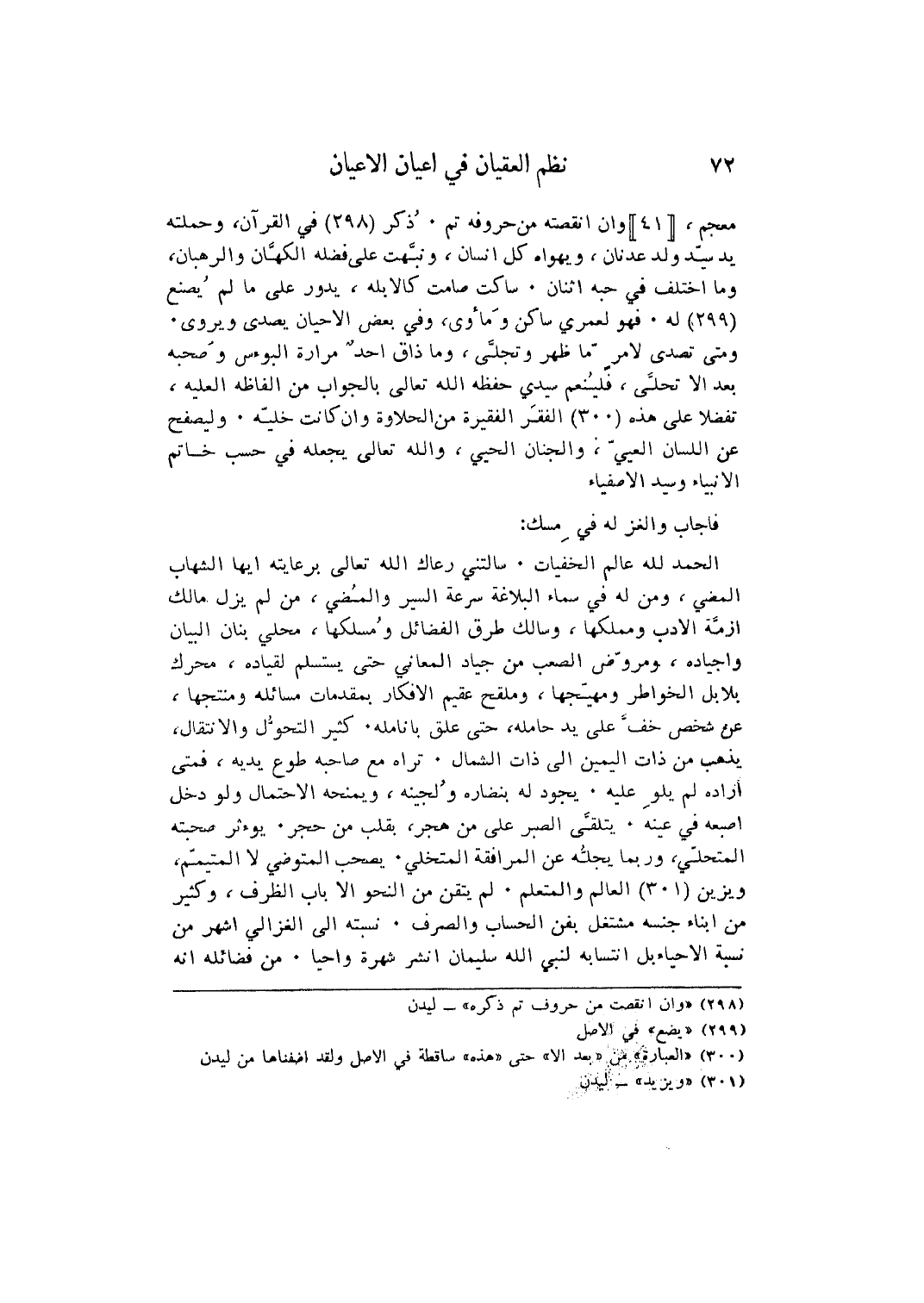 مُعْجم، وان أنقصته من حُرُوفه تمّ. ذكر فِي الْقُرْآن، وَحَمَلته يَد سيد ولد عدنان، ويهواه كل إِنْسَان، ونبهت على فَضله الْكُهَّان والرهبان، وَمَا اخْتلف فِي حبه اثْنَان. سَاكِت صَامت كالأبله، يَدُور على مَا لم يصنع لَهُ. فَهُوَ لعمري سَاكن ومأوى، وَفِي بعض الأحيان يصدى ويروى. وَمَتى تصدى لأمر مَا ظهر وتجلى، وَمَا ذاق أحد مرَارَة البوءس وَصَحبه بعد إِلَّا تحلى، فلينعم سَيِّدي حفظه الله تَعَالَى بِالْجَوَابِ من الفاظه العليه، تفضلا على هَذِه الْفقر الفقيرة من الْحَلَاوَة وان كَانَت خليه. وليصفح عَن اللِّسَان العيي، والجنان الْحَيِي، وَالله تَعَالَى يَجعله فِي حسب خَاتم الْأَنْبِيَاء وَسيد الأصفياء.