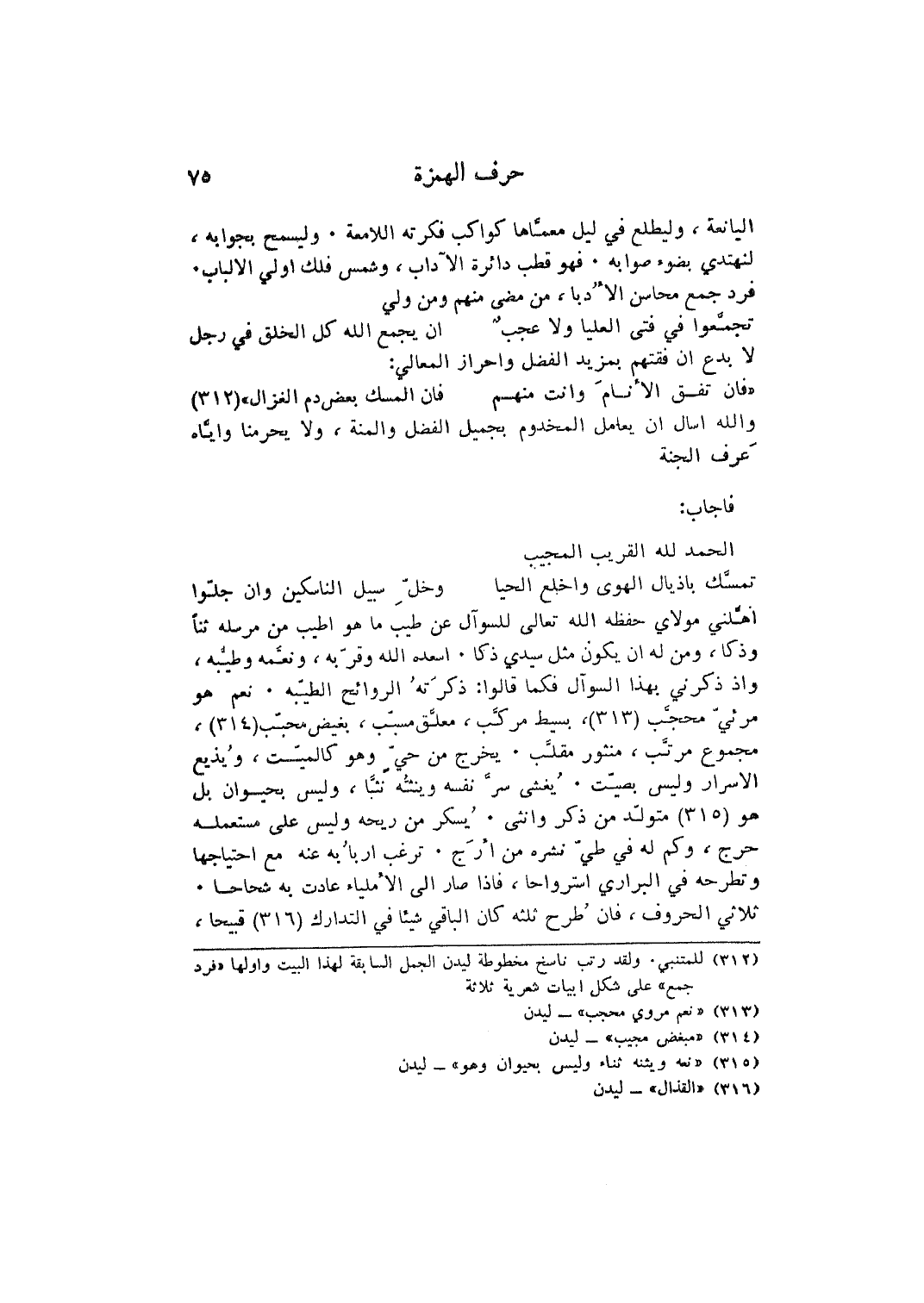 اليانعة، وليطلع فِي ليل معماها كواكب فكرته اللامعة. وليسمح بجوابه، لنهتدي بضوء صَوَابه. فَهُوَ قطب دَائِرَة الْآدَاب، وشمس فلك أولي الْأَلْبَاب. فَرد جمع محَاسِن الأُدبا، من مضى مِنْهُم وَمن ولي.
