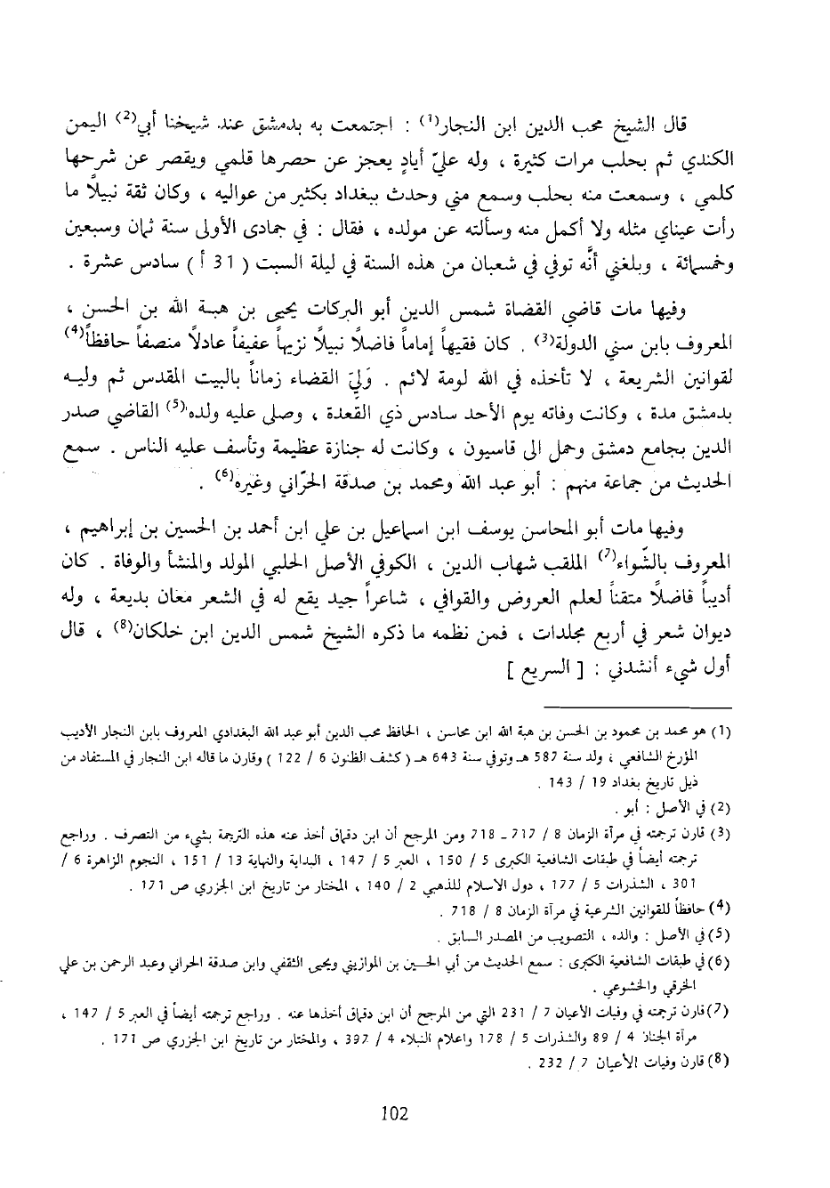 (¬1) هو محمد بن محمود بن الحسن بن هبة الله ابن محاسن، الحافظ محب الدين أبو عبد الله البغدادي المعروف بابن النجار الأديب المؤرخ الشافعي، ولد سنة 587 هـ وتوفي سنة 643 هـ (كشف الظنون 6/ 122) وقارن ما قاله ابن النجار في المستفاد من ذيل تاريخ بغداد 19/ 143.