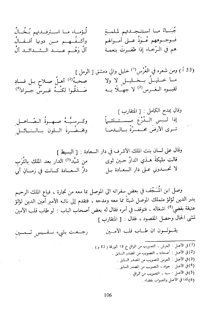 وصل ابن المسجّف في بعض سفراته الى الموصل بما معه من تجارة، فباع الملك الرحيم بدر الدين لؤلؤ متملك الموصل شيئا مما معه ومدحه، فتقدم إلى نائبه الأمير أمين الدين لؤلؤ عتيقة بقضي (¬6) اشغاله، فتوقف في أمره فقال له بعض أصحاب الباب: لو طاب قلب الأمين لمشى الحال وحصل المقصود، فقال: [المتقارب]