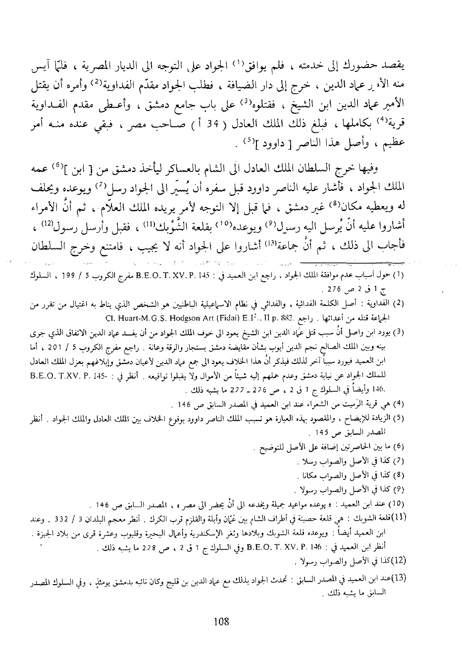 (¬3) يورد ابن واصل أنّ سبب قتل عماد الدين ابن الشيخ يعود الى خوف الملك الجواد من أن يفسد عماد الدين الاتفاق الذي جرى بينه وبين الملك الصالح نجم الدين أيوب بشأن مقايضة دمشق بسنجار والرقة وعانة. راجع مفرج الكروب 5/ 201، أما ابن العميد فيورد سببا آخر لذلك فيذكر أنّ هذا الخلاف يعود الى جمع عماد الدين لأعيان دمشق وإبلاغهم بعزل الملك العادل للملك الجواد عن نيابة دمشق وعدم حملهم إليه شيئا من الأموال ولا يقبلوا تواقيعه. أنظر في: