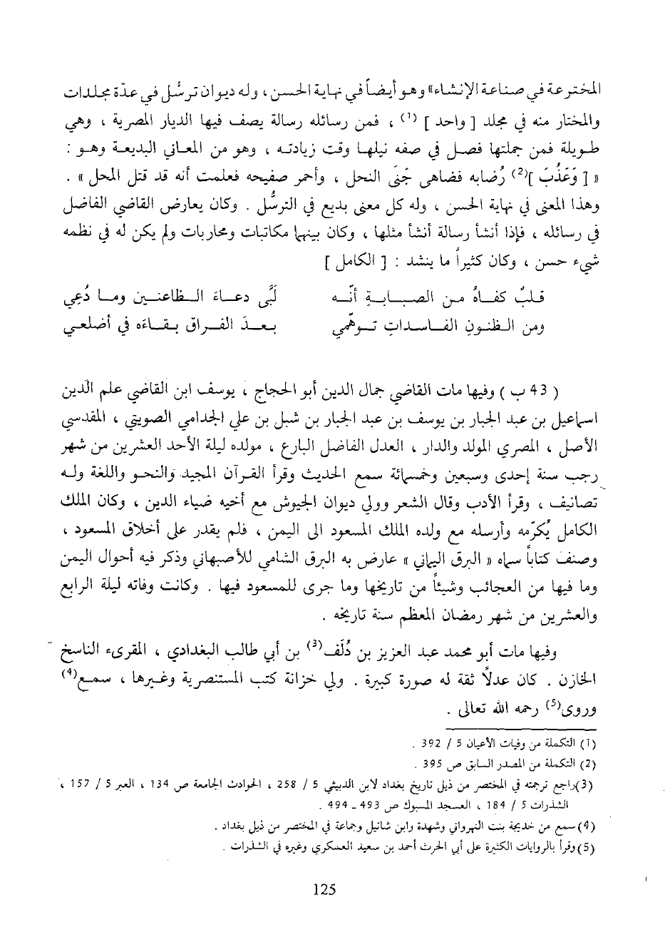 (43 ب) وفيها مات القاضي جمال الدين أبو الحجاج، يوسف ابن القاضي علم الدين اسماعيل بن عبد الجبار بن يوسف بن عبد الجبار بن شبل بن علي الجدامي الصويتي، المقدسي الأصل، المصري المولد والدار، العدل الفاضل البارع، مولده ليلة الأحد العشرين من شهر رجب سنة إحدى وسبعين وخمسمائة سمع الحديث وقرأ القرآن المجيد والنحو واللغة وله تصانيف، وقرأ الأدب وقال الشعر وولي ديوان الجيوش مع أخيه ضياء الدين، وكان الملك الكامل يكرّمه وأرسله مع ولده الملك المسعود الى اليمن، فلم يقدر على أخلاق المسعود، وصنف كتابا سماه «البرق اليماني» عارض به البرق الشامي للأصبهاني وذكر فيه أحوال اليمن وما فيها من العجائب وشيئا من تاريخها وما جرى للمسعود فيها. وكانت وفاته ليلة الرابع والعشرين من شهر رمضان المعظم سنة تاريخه.