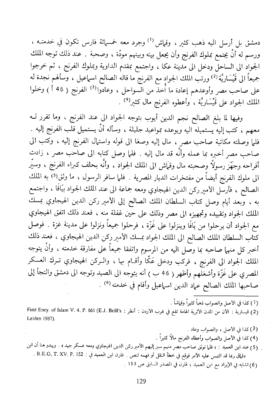 وفيها لما بلغ الصالح نجم الدين أيوب بتوجه الجواد الى عند الفرنج، وما تقرر له معهم، كتب إليه يستميله اليه ويوعده بمواعيد جليلة، وسأله أن يستميل قلب الفرنج إليه.