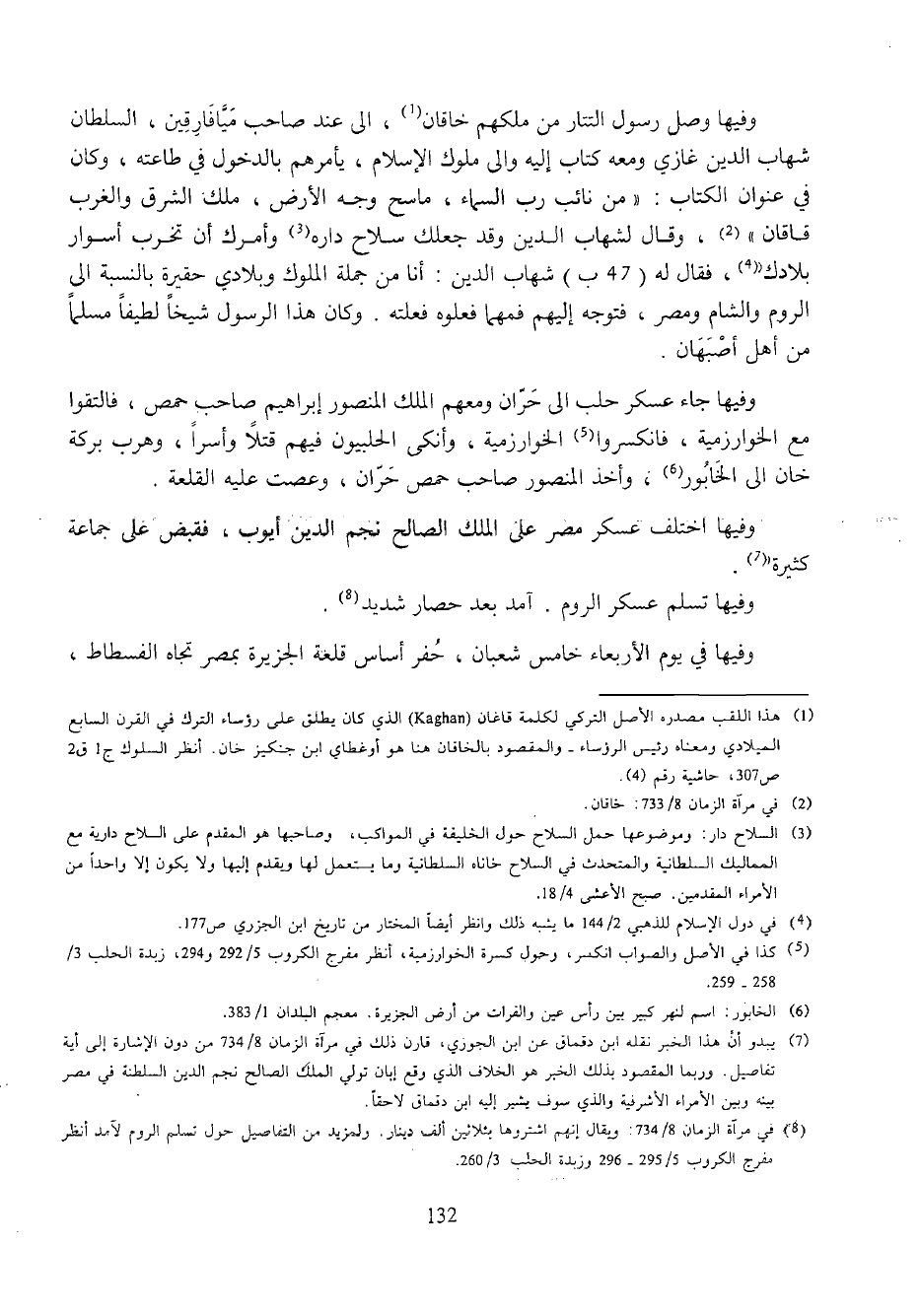 وفيها وصل رسول التتار من ملكهم خاقان (¬1)، الى عند صاحب ميّافارقين، السلطان شهاب الدين غازي ومعه كتاب إليه والى ملوك الإسلام، يأمرهم بالدخول في طاعته، وكان في عنوان الكتاب: «من نائب رب السماء، ماسح وجه الأرض، ملك الشرق والغرب قاقان» (¬2)، وقال لشهاب الدين وقد جعلك سلاح داره (¬3) وأمرك أن تخرب أسوار بلادك (¬4)، فقال له (47 ب) شهاب الدين: أنا من جملة الملوك وبلادي حقيرة بالنسبة الى الروم والشام ومصر، فتوجه إليهم فمهما فعلوه فعلته. وكان هذا الرسول شيخا لطيفا مسلما من أهل أصبهان.