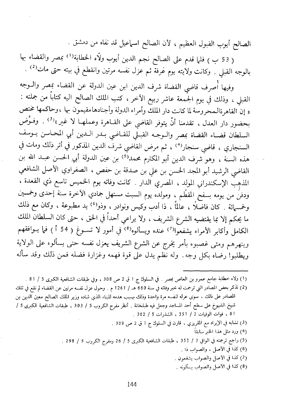 (¬2) تذكر بعض المصادر التي ترجمت له خبر وفاته في سنة 660 هـ / 1261 م. وحول عزل نفسه مرتين عن القضاء لم نقع في تلك المصادر على ذلك، سوى عزله لنفسه مرة واحدة وذلك بسبب هدمه للبناء الذي شاده وزير الملك الصالح معين الدين بن شيخ الشيوخ على سطح أحد المساجد وجعل فيه طبلخانة. أنظر مفرج الكروب 5/ 303، طبقات الشافعية الكبرى 5/ 81، فوات الوفيات 2/ 351، الشذرات 5/ 302.
