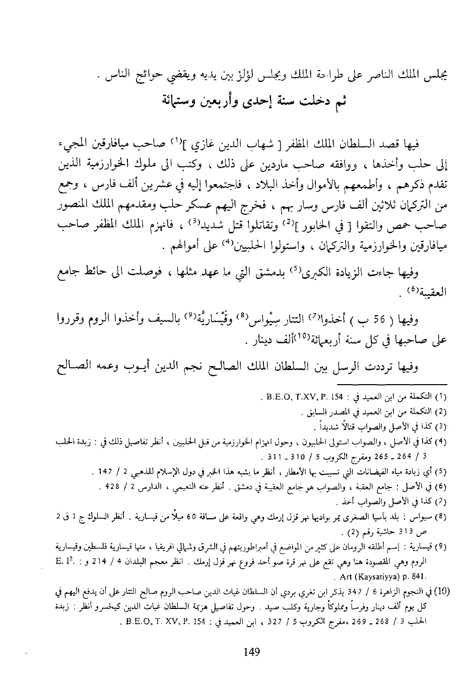 (¬4) كذا في الأصل، والصواب استولى الحلبيون، وحول انهزام الخوارزمية من قبل الحلبيين، أنظر تفاصيل ذلك في: زبدة الحلب 3/ 264 - 265 ومفرج الكروب 5/ 310 - 311.