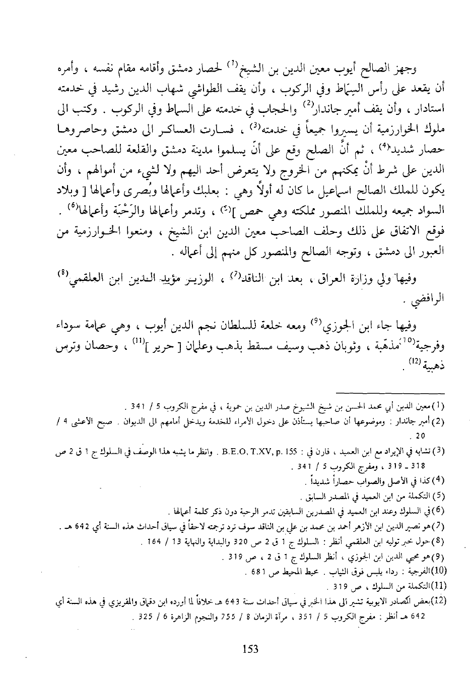 (¬12) بعض المصادر الايوبية تشير الى هذا الخبر في سياق أحداث سنة 643 هـ خلافا لما أورده ابن دقماق والمقريزي في هذه السنة أي 642 هـ أنظر: مفرج الكروب 5/ 351، مرآة الزمان 8/ 755 والنجوم الزاهرة 6/ 325.