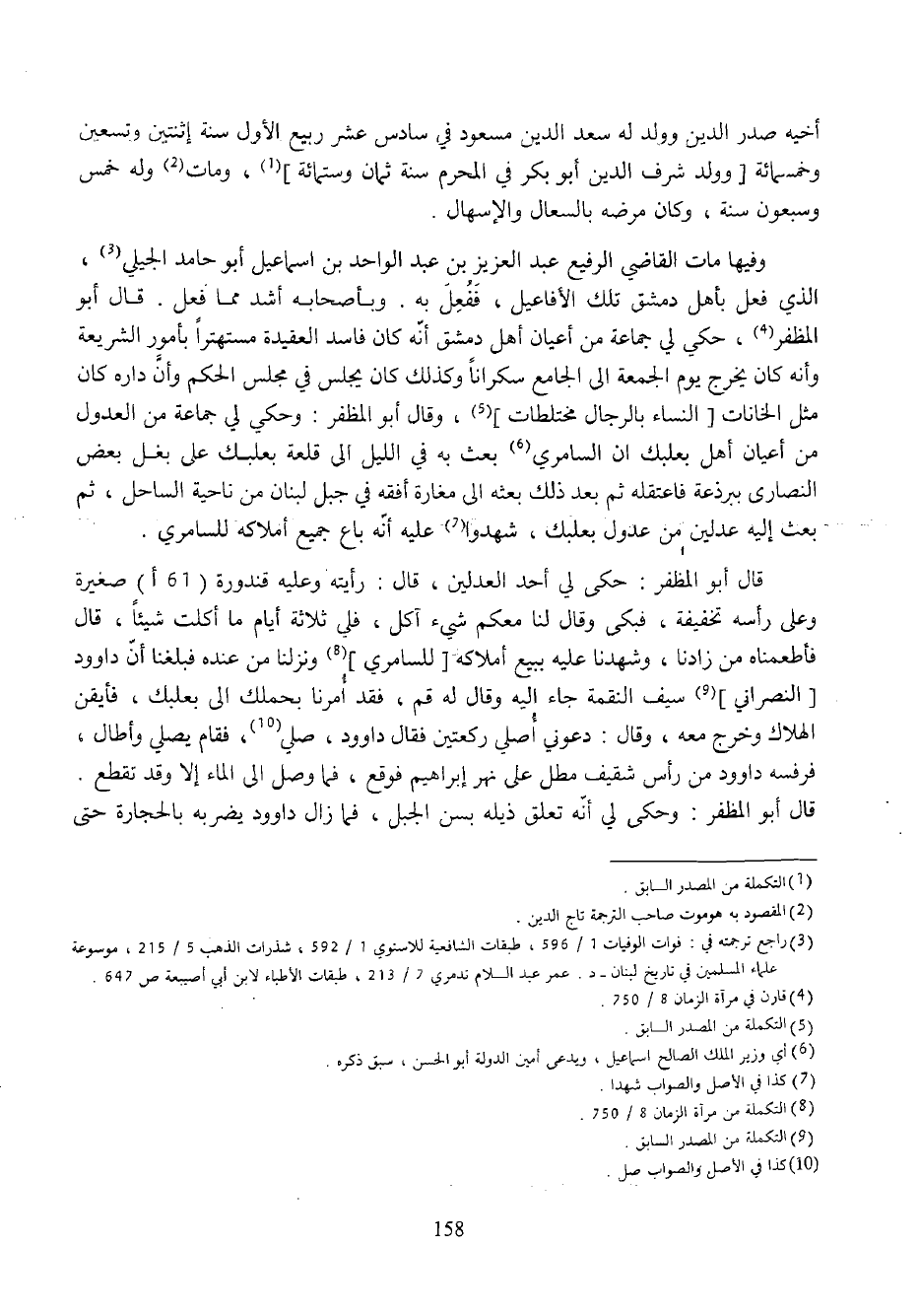 قال أبو المظفر: حكى لي أحد العدلين، قال: رأيته وعليه قندورة (61 أ) صغيرة وعلى رأسه تخفيفة، فبكى وقال لنا معكم شيء آكل، فلي ثلاثة أيام ما أكلت شيئا، قال فأطعمناه من زادنا، وشهدنا عليه ببيع أملاكه [للسامري] (¬8) ونزلنا من عنده فبلغنا أنّ داوود [النصراني] (¬9) سيف النقمة جاء اليه وقال له قم، فقد أمرنا بحملك الى بعلبك، فأيقن الهلاك وخرج معه، وقال: دعوني أصلي ركعتين فقال داوود، صلي (¬10)، فقام يصلي وأطال، فرفسه داوود من رأس شقيف مطل على نهر إبراهيم فوقع، فما وصل الى الماء إلا وقد تقطع.