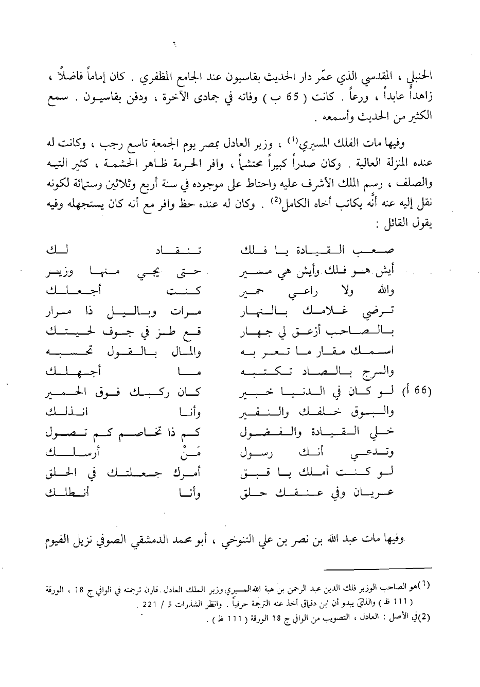 (¬1) هو الصاحب الوزير فلك الدين عبد الرحمن بن هبة الله المسيري وزير الملك العادل. قارن ترجمته في الوافي ج 18، الورقة (111 ظ) والذي يبدو أن ابن دقماق أخذ عنه الترجمة حرفيا. وانظر الشذرات 5/ 221.