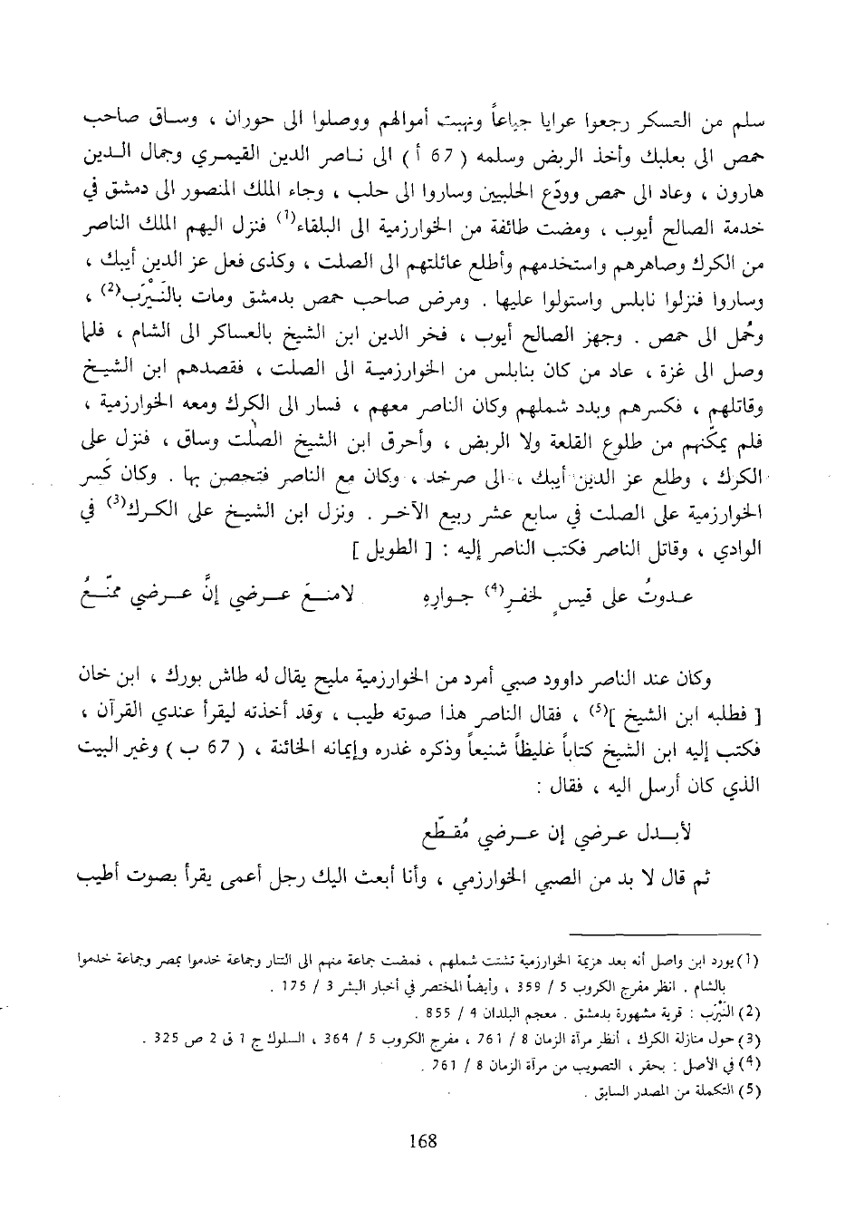 سلم من العسكر رجعوا عرايا جياعا ونهبت أموالهم ووصلوا الى حوران، وساق صاحب حمص الى بعلبك وأخذ الربض وسلمه (67 أ) الى ناصر الدين القيمري وجمال الدين هارون، وعاد الى حمص وودّع الحلبيين وساروا الى حلب، وجاء الملك المنصور الى دمشق في خدمة الصالح أيوب، ومضت طائفة من الخوارزمية الى البلقاء (¬1) فنزل اليهم الملك الناصر من الكرك وصاهرهم واستخدمهم وأطلع عائلتهم الى الصلت، وكذى فعل عز الدين أيبك، وساروا فنزلوا نابلس واستولوا عليها. ومرض صاحب حمص بدمشق ومات بالنيرب (¬2)، وحمل الى حمص. وجهز الصالح أيوب، فخر الدين ابن الشيخ بالعساكر الى الشام، فلما وصل الى غزة، عاد من كان بنابلس من الخوارزمية الى الصلت، فقصدهم ابن الشيخ وقاتلهم، فكسرهم وبدد شملهم وكان الناصر معهم، فسار الى الكرك ومعه الخوارزمية، فلم يمكّنهم من طلوع القلعة ولا الربض، وأحرق ابن الشيخ الصلت وساق، فنزل على الكرك، وطلع عز الدين أيبك، الى صرخد، وكان مع الناصر فتحصن بها. وكان كسر الخوارزمية على الصلت في سابع عشر ربيع الآخر. ونزل ابن الشيخ على الكرك (¬3) في الوادي، وقاتل الناصر فكتب الناصر إليه: [الطويل]