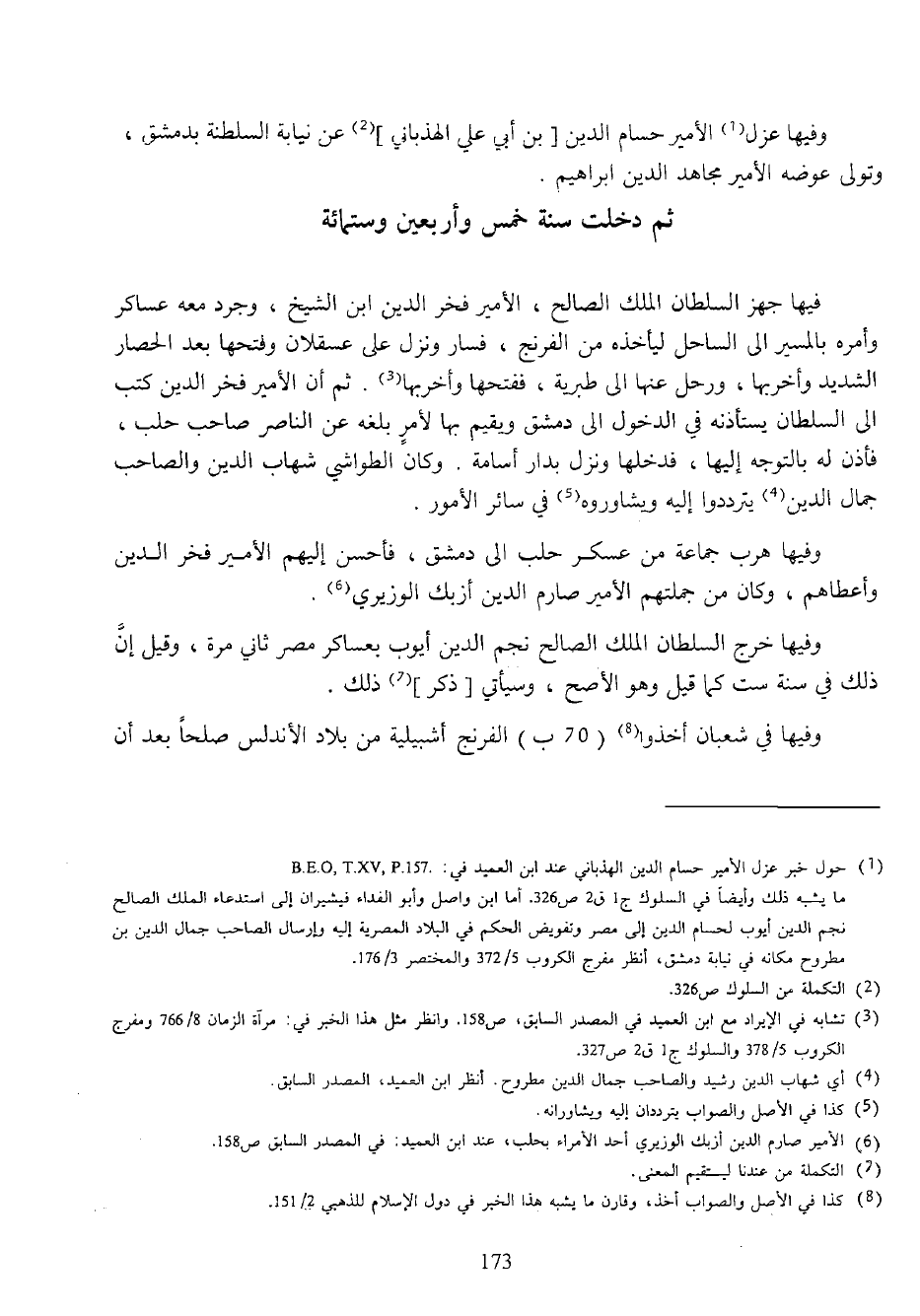 ما يشبه ذلك وأيضا في السلوك ج 1 ق 2 ص 326. أما ابن واصل وأبو الفداء فيشيران إلى استدعاء الملك الصالح نجم الدين أيوب لحسام الدين إلى مصر وتفويض الحكم في البلاد المصرية إليه وإرسال الصاحب جمال الدين بن مطروح مكانه في نيابة دمشق، أنظر مفرج الكروب 5/ 372 والمختصر 3/ 176.