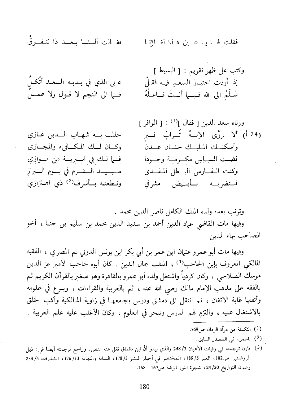 (¬3) قارن ترجمته في وفيات الأعيان 3/ 248 والذي يبدو أنّ ابن دقماق نقل عنه النص. وراجع ترجمته أيضا في: ذيل الروضتين ص 182، العبر 5/ 189، المختصر في أخبار البشر 3/ 178، البداية والنهاية 13/ 176، الشذرات 5/ 234 وعيون التواريخ 20/ 24، شجرة النور الزكية ص 167 - 168.