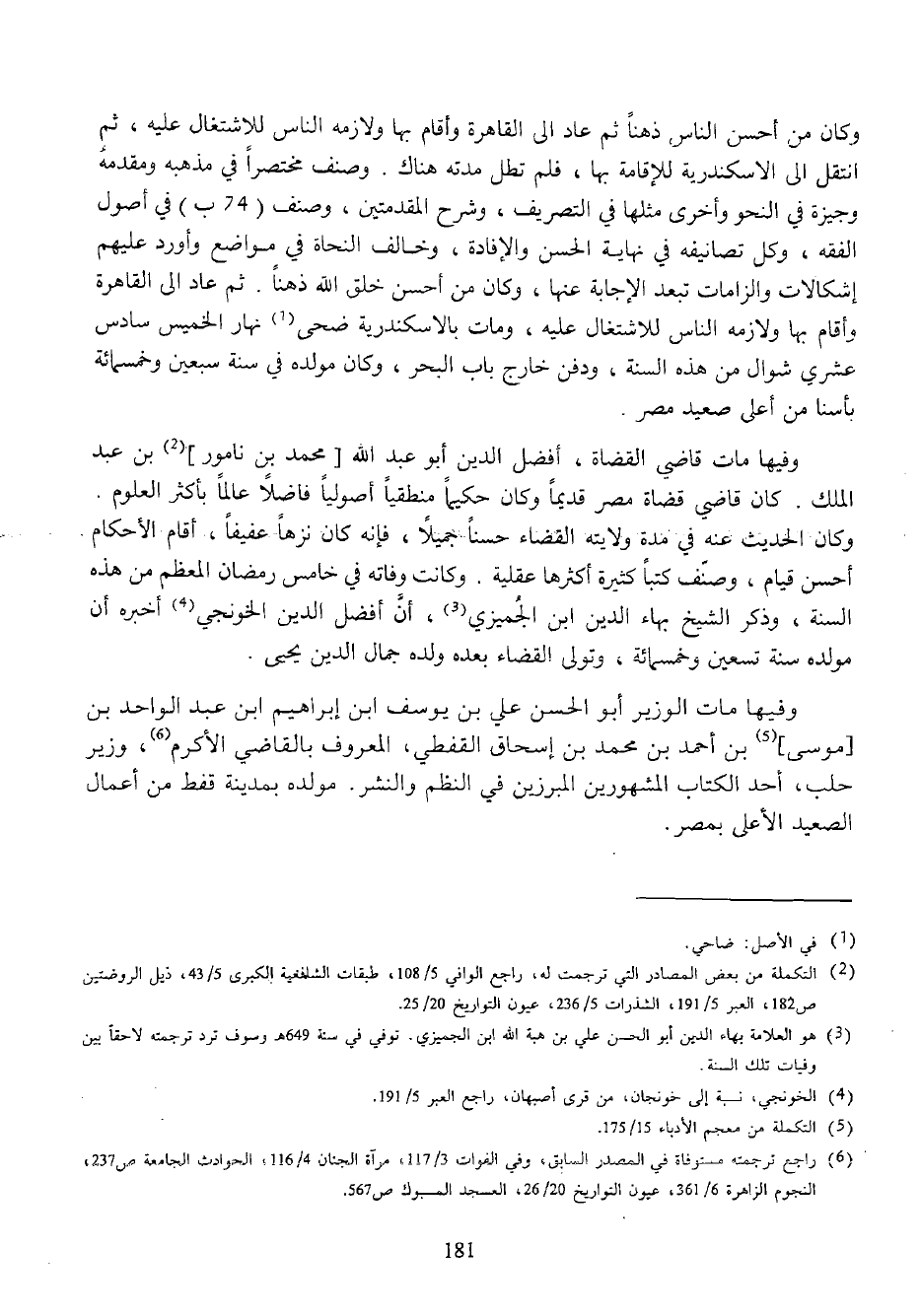 (¬3) هو العلامة بهاء الدين أبو الحسن علي بن هبة الله ابن الجميزي. توفي في سنة 649 هـ وسوف ترد ترجمته لاحقا بين وفيات تلك السنة.