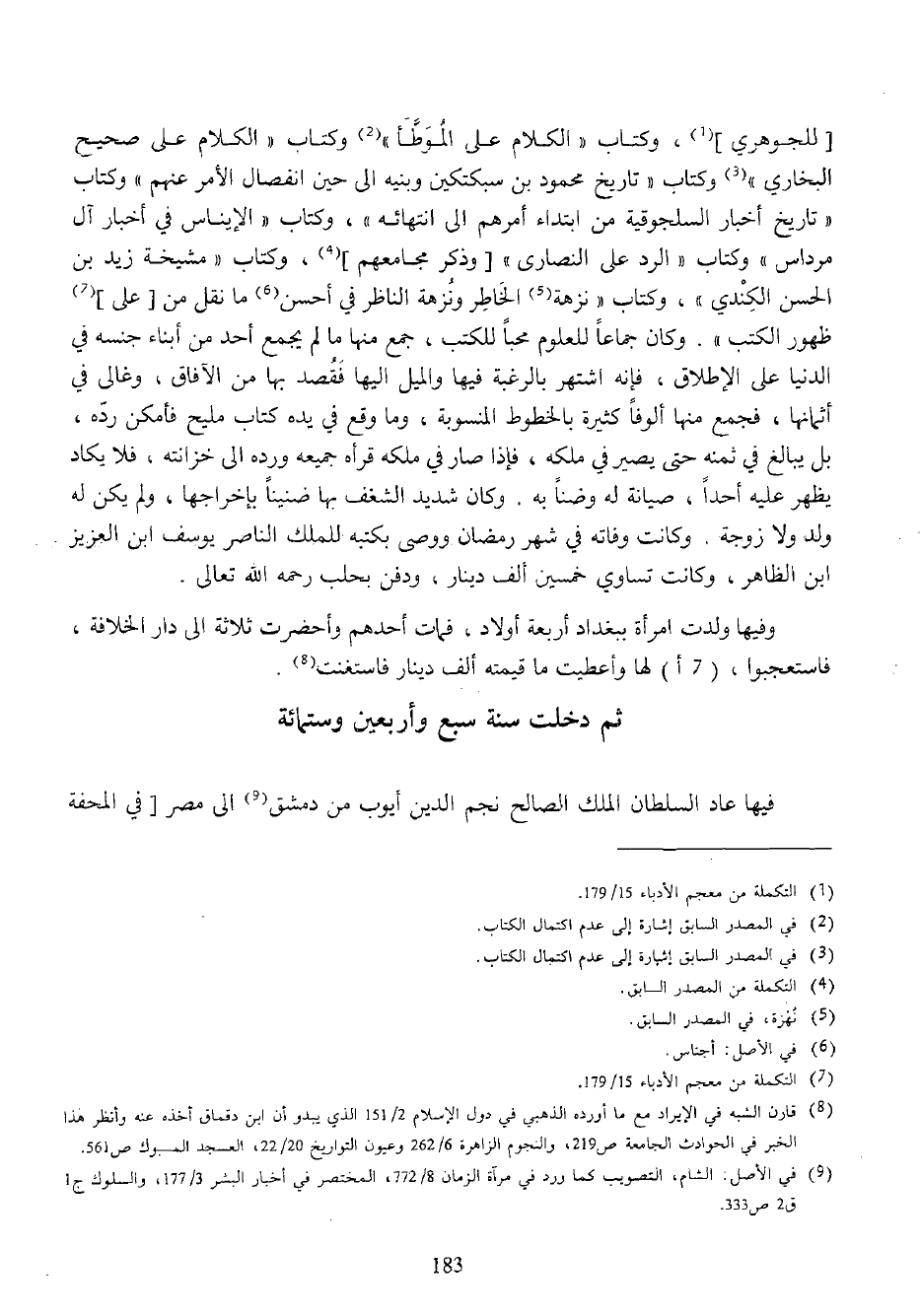 [للجوهري] (¬1)، وكتاب «الكلام على الموطّأ» (¬2) وكتاب «الكلام على صحيح البخاري» (¬3) وكتاب «تاريخ محمود بن سبكتكين وبنيه الى حين انفصال الأمر عنهم» وكتاب «تاريخ أخبار السلجوقية من ابتداء أمرهم الى انتهائه»، وكتاب «الإيناس في أخبار آل مرداس» وكتاب «الرد على النصارى» [وذكر مجامعهم] (¬4)، وكتاب «مشيخة زيد بن الحسن الكندي»، وكتاب «نزهة (¬5) الخاطر ونزهة الناظر في أحسن (¬6) ما نقل من [على] (¬7) ظهور الكتب». وكان جماعا للعلوم محبا للكتب، جمع منها ما لم يجمع أحد من أبناء جنسه في الدنيا على الإطلاق، فإنه اشتهر بالرغبة فيها والميل اليها فقصد بها من الآفاق، وغالى في أثمانها، فجمع منها ألوفا كثيرة بالخطوط المنسوبة، وما وقع في يده كتاب مليح فأمكن ردّه، بل يبالغ في ثمنه حتى يصير في ملكه، فإذا صار في ملكه قرأه جميعه ورده الى خزانته، فلا يكاد يظهر عليه أحدا، صيانة له وضنا به. وكان شديد الشغف بها ضنينا بإخراجها، ولم يكن له ولد ولا زوجة. وكانت وفاته في شهر رمضان ووصى بكتبه للملك الناصر يوسف ابن العزيز ابن الظاهر، وكانت تساوي خمسين ألف دينار، ودفن بحلب رحمه الله تعالى.