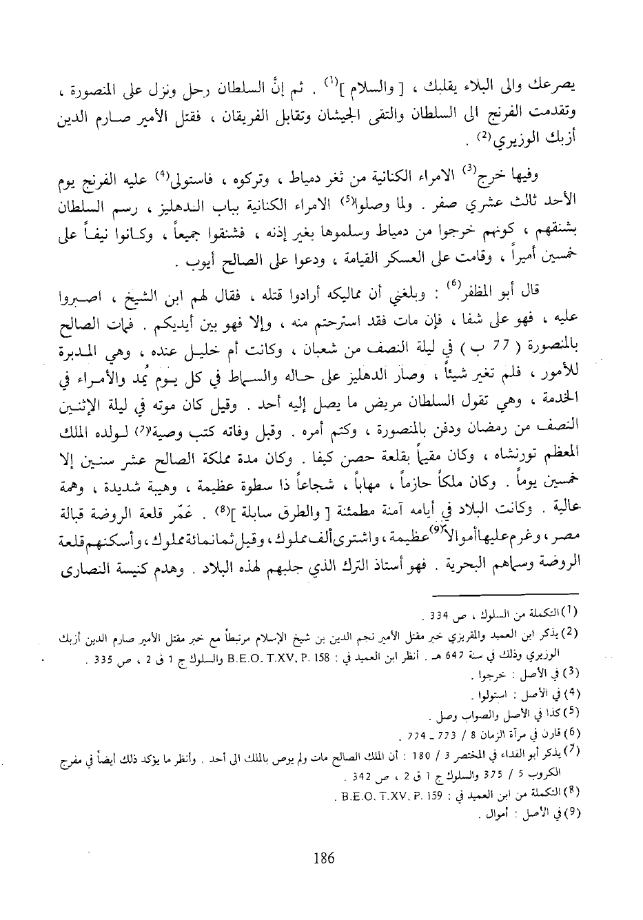 (¬7) يذكر أبو الفداء في المختصر 3/ 180: أن الملك الصالح مات ولم يوص بالملك الى أحد. وأنظر ما يؤكد ذلك أيضا في مفرج الكروب 5/ 375 والسلوك ج 1 ق 2، ص 342.