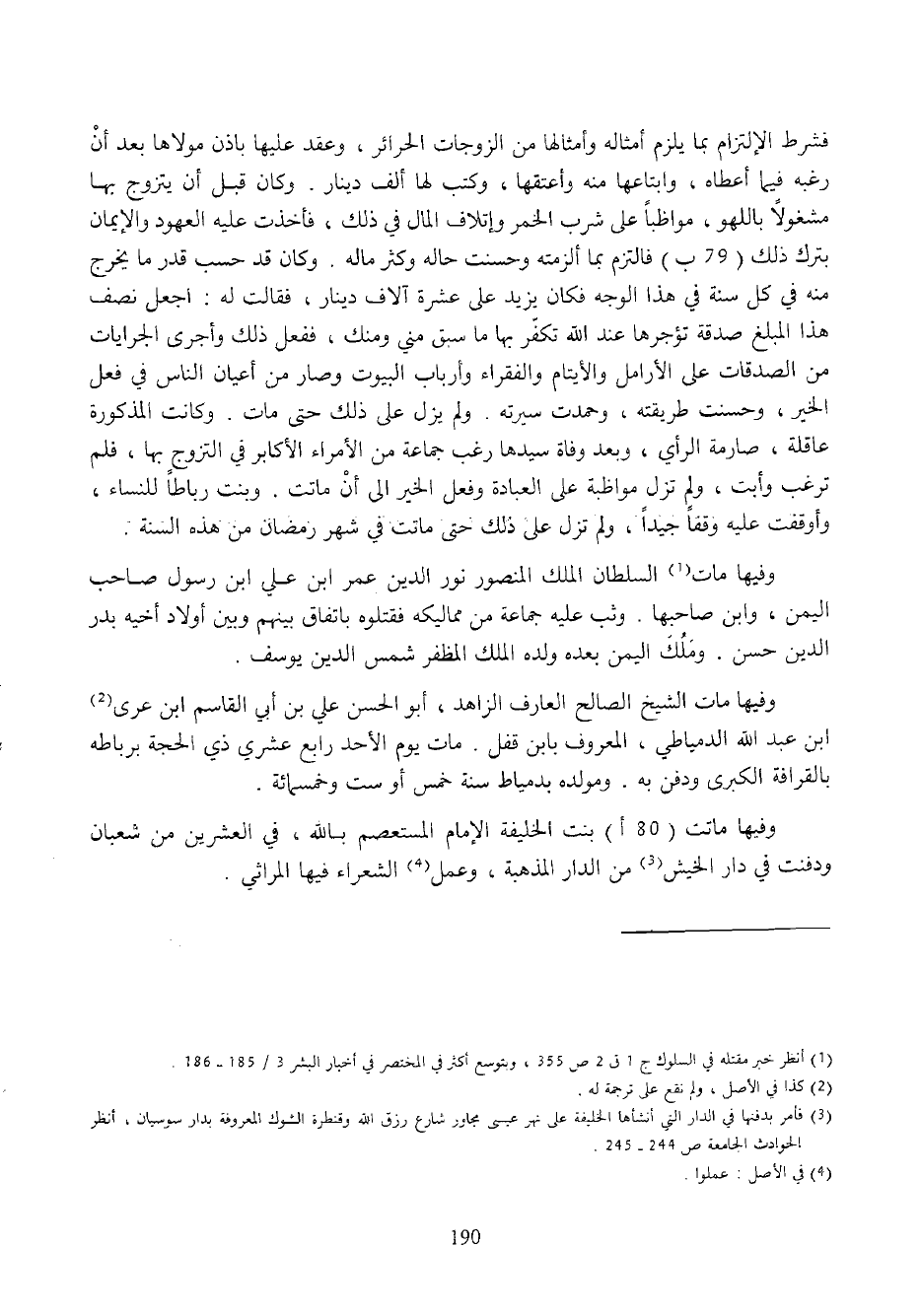 فشرط الإلتزام بما يلزم أمثاله وأمثالها من الزوجات الحرائر، وعقد عليها باذن مولاها بعد أن رغبه فيما أعطاه، وابتاعها منه وأعتقها، وكتب لها ألف دينار. وكان قبل أن يتزوج بها مشغولا باللهو، مواظبا على شرب الخمر وإتلاف المال في ذلك، فأخذت عليه العهود والإيمان بترك ذلك (79 ب) فالتزم بما ألزمته وحسنت حاله وكثر ماله. وكان قد حسب قدر ما يخرج منه في كل سنة في هذا الوجه فكان يزيد على عشرة آلاف دينار، فقالت له: اجعل نصف هذا المبلغ صدقة تؤجرها عند الله تكفّر بها ما سبق مني ومنك، ففعل ذلك وأجرى الجرايات من الصدقات على الأرامل والأيتام والفقراء وأرباب البيوت وصار من أعيان الناس في فعل الخير، وحسنت طريقته، وحمدت سيرته. ولم يزل على ذلك حتى مات. وكانت المذكورة عاقلة، صارمة الرأي، وبعد وفاة سيدها رغب جماعة من الأمراء الأكابر في التزوج بها، فلم ترغب وأبت، ولم تزل مواظبة على العبادة وفعل الخير الى أن ماتت. وبنت رباطا للنساء، وأوقفت عليه وقفا جيدا، ولم تزل على ذلك حتى ماتت في شهر رمضان من هذه السنة.