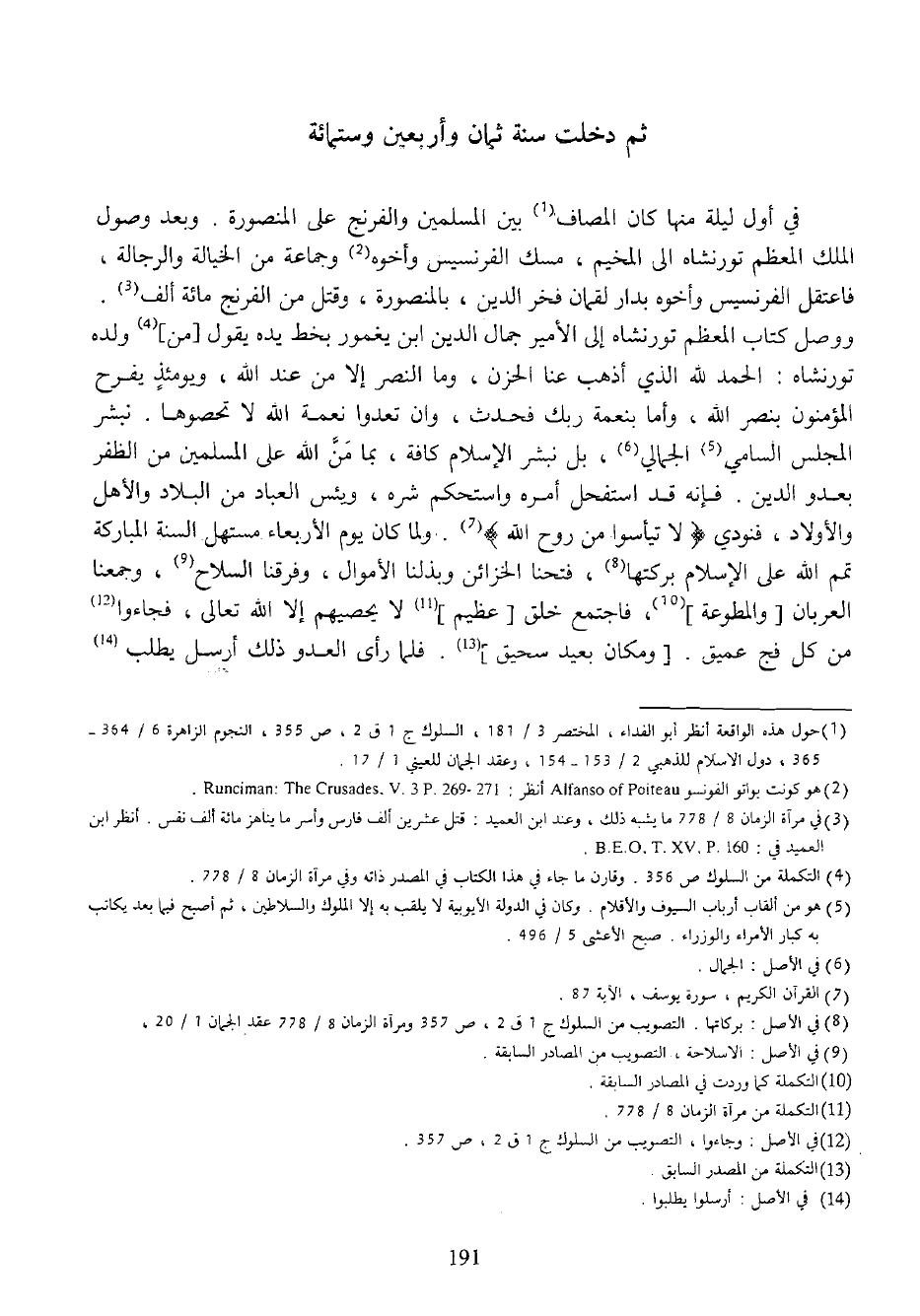 ووصل كتاب المعظم تورنشاه إلى الأمير جمال الدين ابن يغمور بخط يده يقول [من] (¬4) ولده تورنشاه: الحمد لله الذي أذهب عنا الحزن، وما النصر إلا من عند الله، ويومئذ يفرح المؤمنون بنصر الله، وأما بنعمة ربك فحدث، وان تعدوا نعمة الله لا تحصوها. نبشر المجلس السامي (¬5) الجمالي (¬6)، بل نبشر الإسلام كافة، بما منّ الله على المسلمين من الظفر بعدو الدين. فإنه قد استفحل أمره واستحكم شره، ويئس العباد من البلاد والأهل والأولاد، فنودي {لا تَيْأَسُوا مِنْ رَوْحِ اللهِ} (¬7). ولما كان يوم الأربعاء مستهل السنة المباركة تمم الله على الإسلام بركتها (¬8)، فتحنا الخزائن وبذلنا الأموال، وفرقنا السلاح (¬9)، وجمعنا العربان [والمطوعة] (¬10)، فاجتمع خلق [عظيم] (¬11) لا يحصيهم إلا الله تعالى، فجاءوا (¬12) من كل فج عميق. [ومكان بعيد سحيق] (¬13). فلما رأى العدو ذلك أرسل يطلب (¬14)