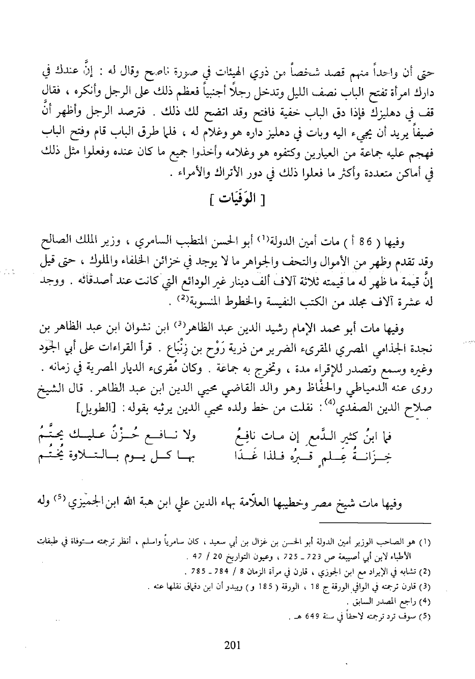 (¬2) تشابه في الإيراد مع ابن الجوزي، قارن في مرآة الزمان 8/ 784 - 785.