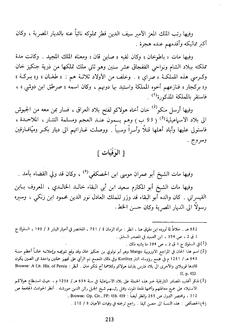 (¬3) تذكر أغلب المصادر التاريخية خبر هذه الحملة على بلاد الاسماعلية في سنة 654 هـ / 1256 م، حيث استطاع هولاكو الاستيلاء على جميع معاقلهم وأهمها قلعة الموت وقتل رئيسهم شيخ الجبل ركن الدين خورشاه. أنظر الحوادث الجامعة ص 312، ومختصر الدول ص 265 وانظر أيضاً:
