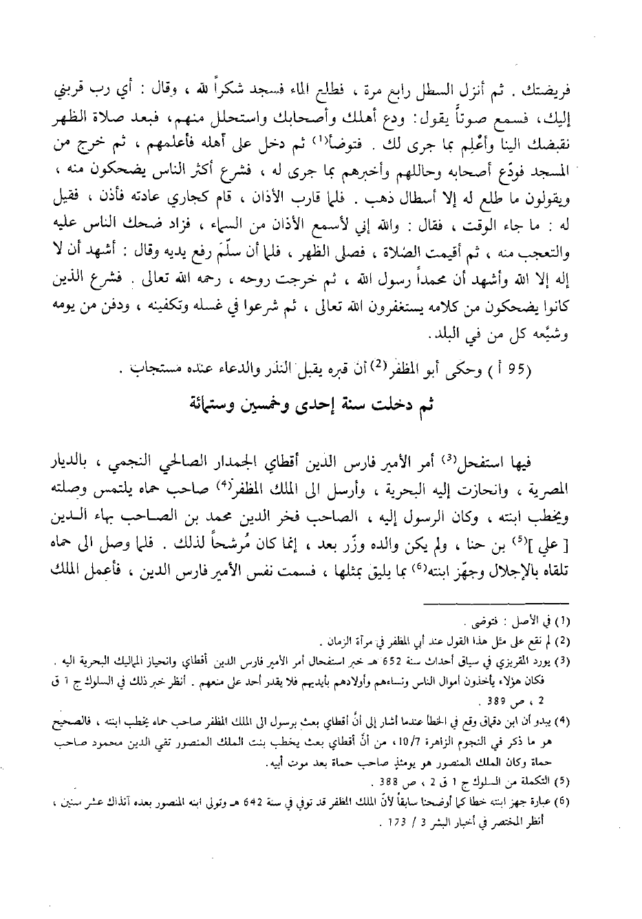 (¬6) عبارة جهز ابنته خطا كما أوضحنا سابقا لأنّ الملك المظفر قد توفي في سنة 642 هـ وتولى ابنه المنصور بعده آنذاك عشر سنين، أنظر المختصر في أخبار البشر 3/ 173.