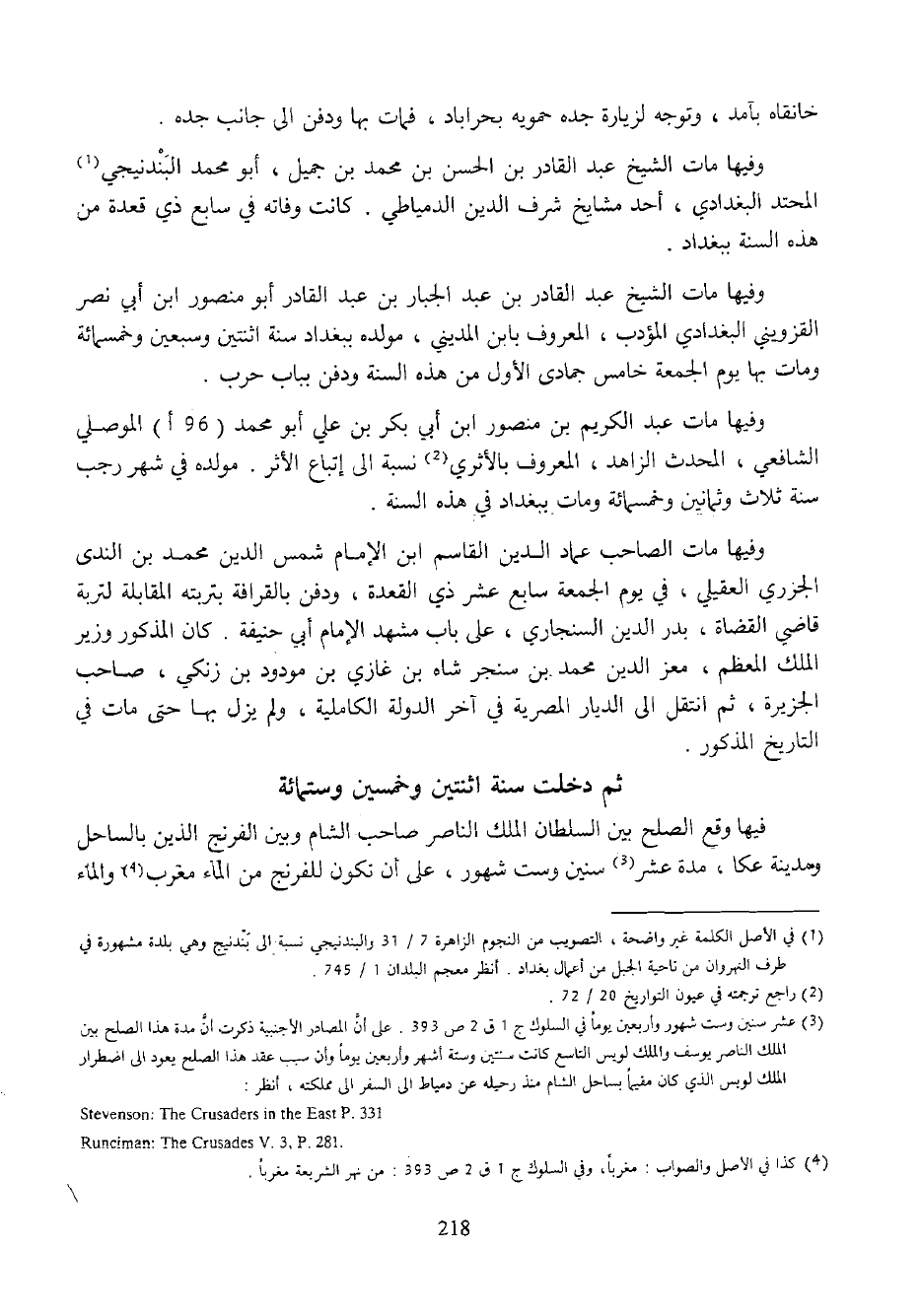 (¬3) عشر سنين وست شهور وأربعين يوما في السلوك ج 1 ق 2 ص 393. على أنّ المصادر الأجنبية ذكرت أنّ مدة هذا الصلح بين الملك الناصر يوسف والملك لويس التاسع كانت سنتين وستة أشهر وأربعين يوما وأن سبب عقد هذا الصلح يعود الى اضطرار الملك لويس الذي كان مقيما بساحل الشام منذ رحيله عن دمياط الى السفر الى مملكته، أنظر: