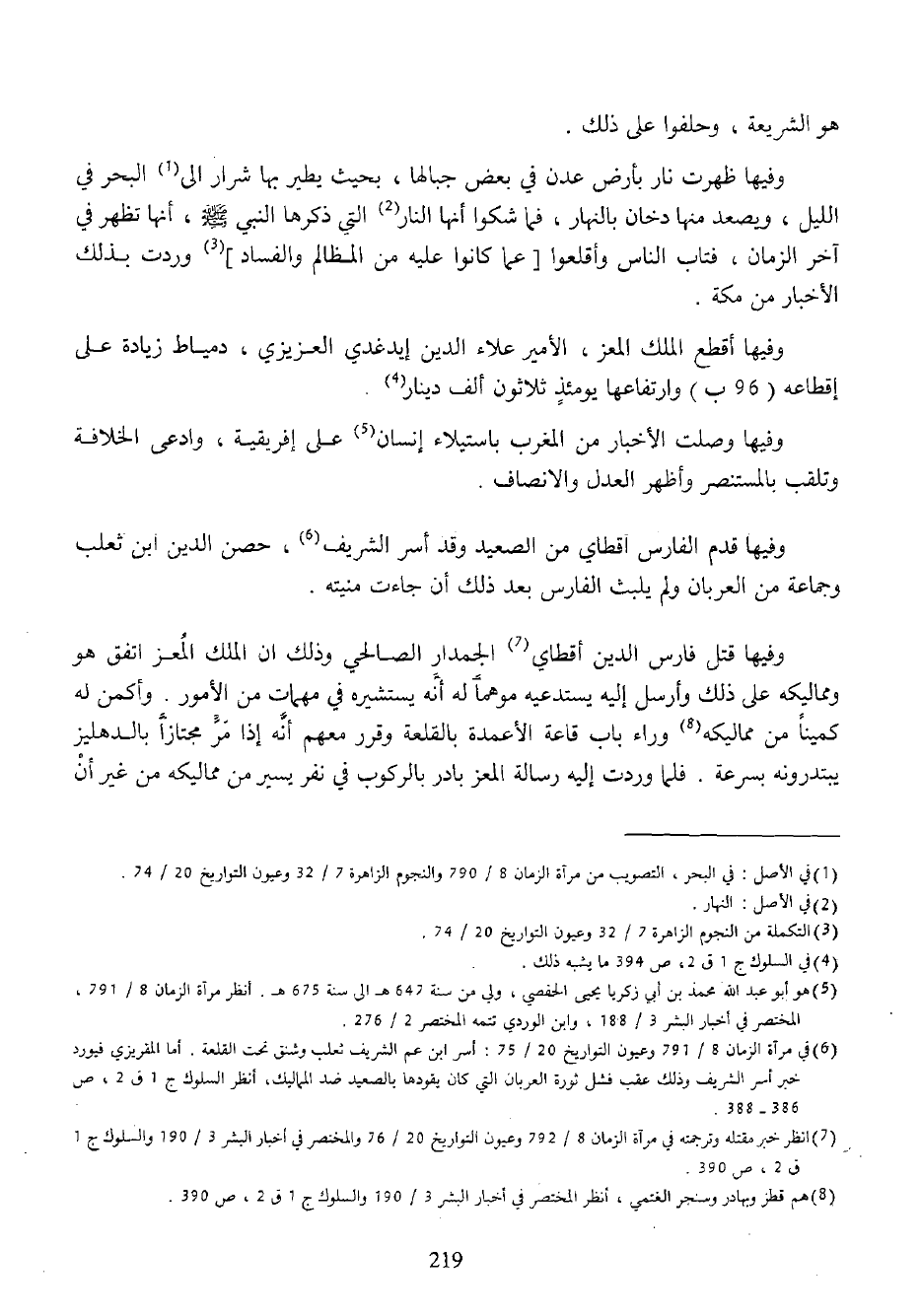 (¬6) في مرآة الزمان 8/ 791 وعيون التواريخ 20/ 75: أسر ابن عم الشريف ثعلب وشنق تحت القلعة. أما المقريزي فيورد خبر أسر الشريف وذلك عقب فشل ثورة العربان التي كان يقودها بالصعيد ضد المماليك، أنظر السلوك ج 1 ق 2، ص 386 - 388.