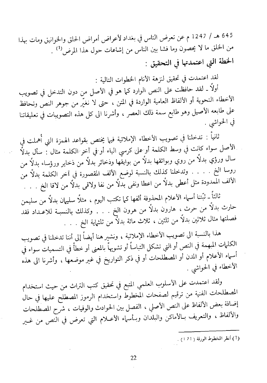 هذا بالنسبة الى تصويب الأخطاء الإملائية، ونشير هنا أيضا إلى أننا تدخلنا في تصويب الكلمات المبهمة في النص أو التي تشكل التباسا أو تشويها بالمعنى أو خطأ في التسميات سواء في أسماء الأعلام أو المدن أو المصطلحات أو في ذكر التواريخ في غير موضعها، وأشرنا الى هذه الأخطاء في الحواشي.