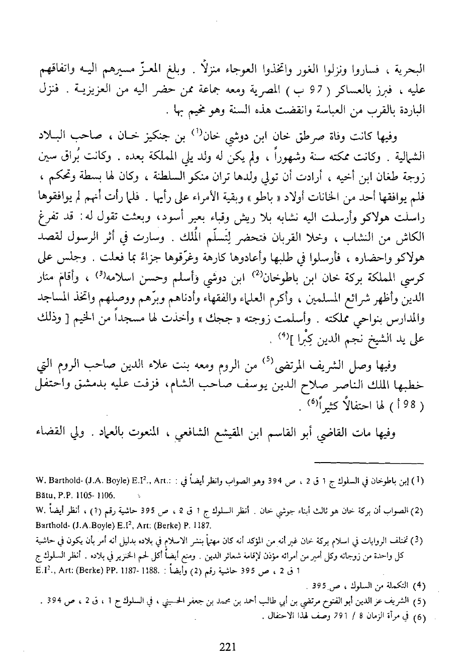 (¬2) الصواب أن بركة خان هو ثالث أبناء جوشي خان. أنظر السلوك ج 1 ق 2، ص 395 حاشية رقم (1)، أنظر أيضا: